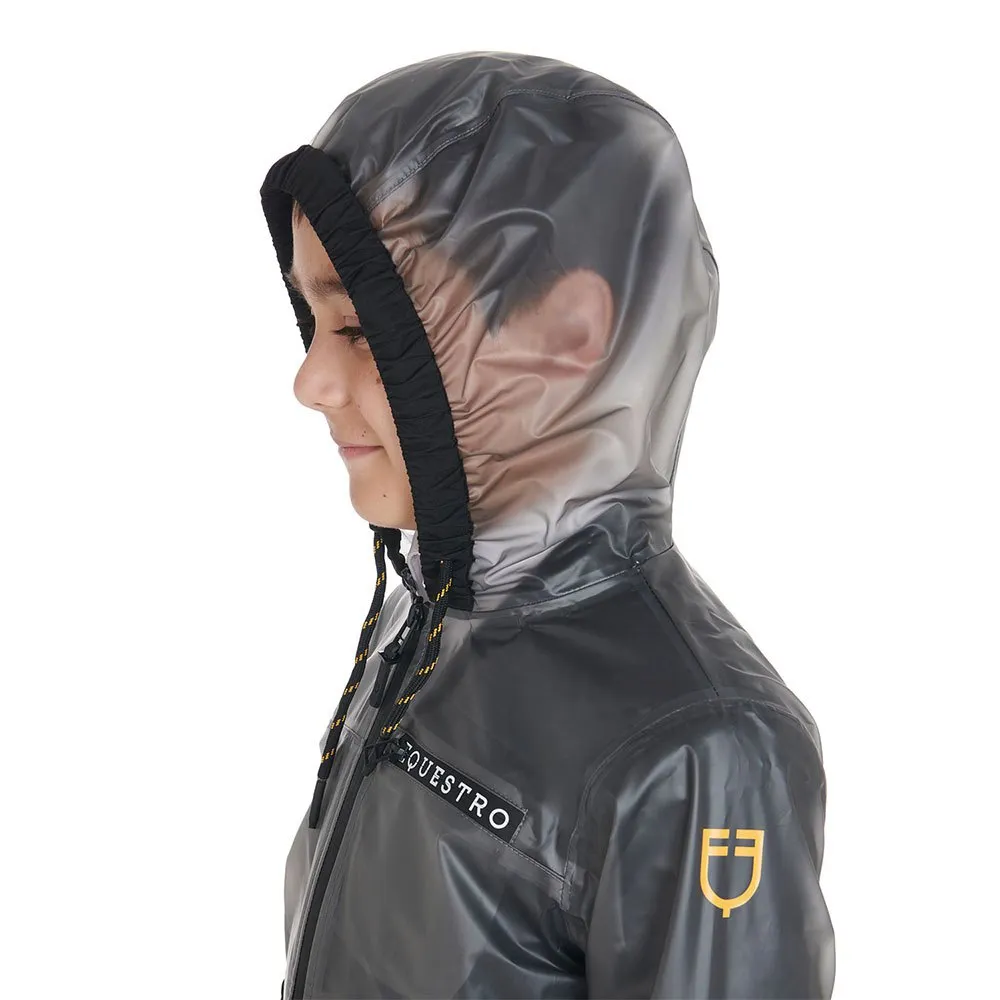 Transparenter Kinderregenmantel mit Kapuze aus einem speziellen wind- und wasserabweisenden Gewebe, das maximalen Schutz vor Wasser und Bewegungsfreiheit garantiert. Alle Nähte und winddichten Reißverschlüsse sind heißversiegelt, um die Wasserdichtigkeit zu gewährleisten. Das gedruckte Logo befindet sich auf der Herzseite, mit Aufnäher am linken Ärmel und Schriftzug am rechten Ärmel. Das Kleidungsstück wurde für jüngere Reiter entwickelt und ist perfekt für den Einsatz an den nassesten Tagen sowohl im Training als auch im Wettkampf.