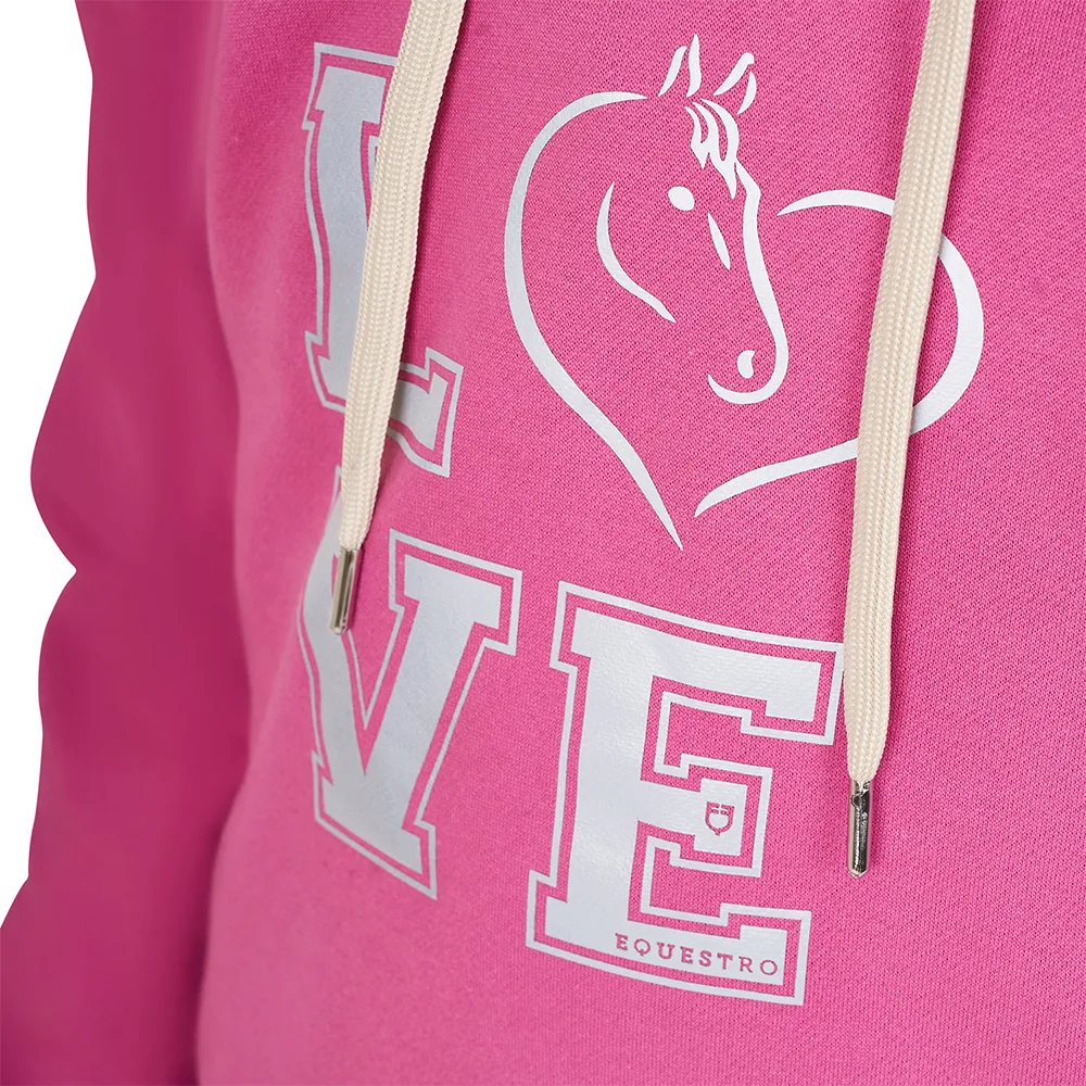 Details: Hochauflösender "Winter Love" Frontdruck, EQUESTRO Logo-Details, integrierte Schutz-Kapuze, vordere Kängurutasche, gerippte Bündchen an Ärmeln und Saum für einen sicheren Sitz