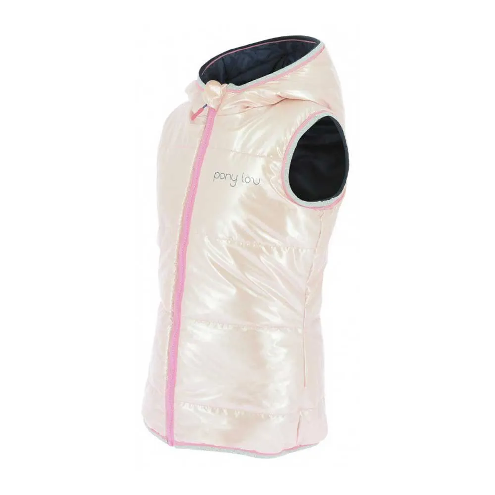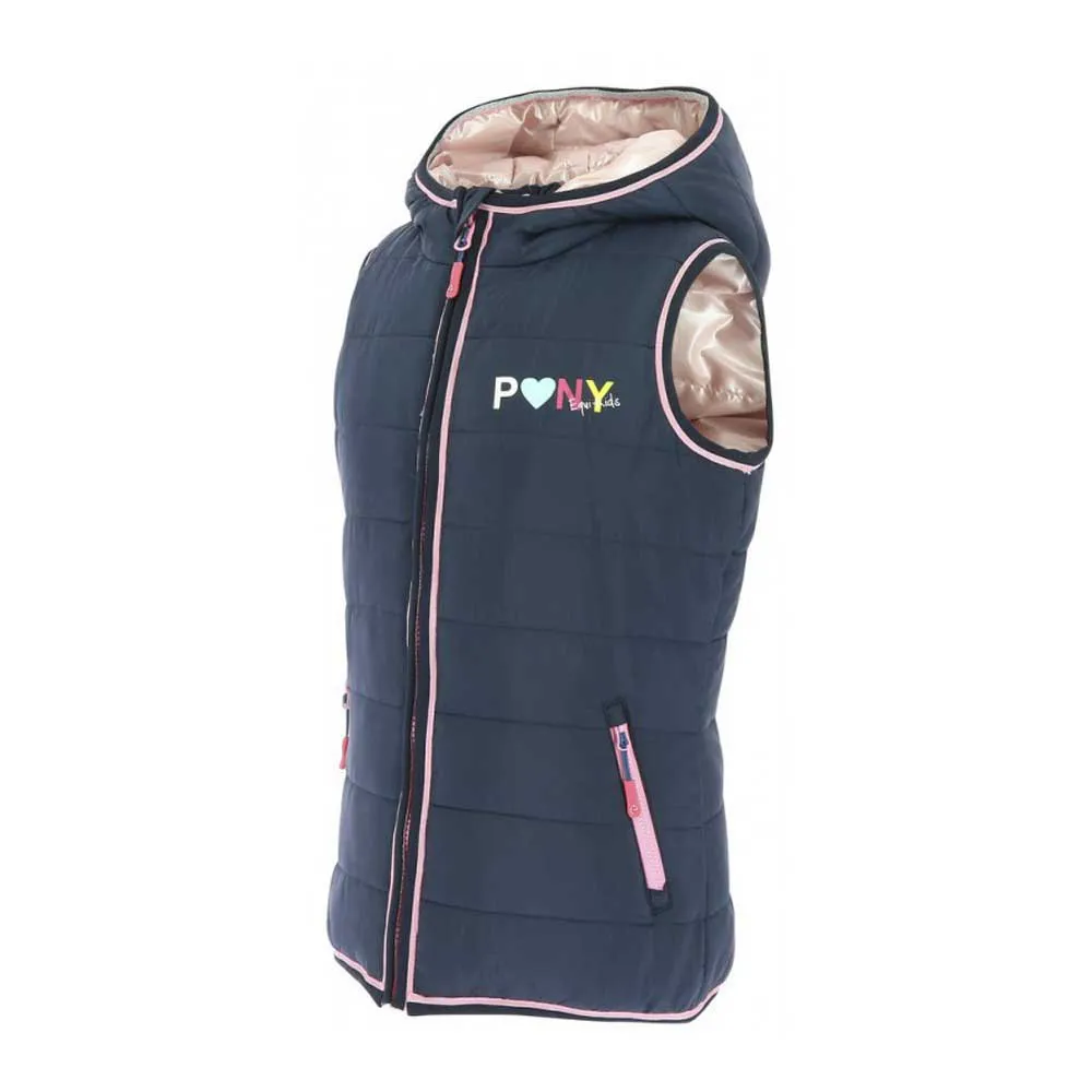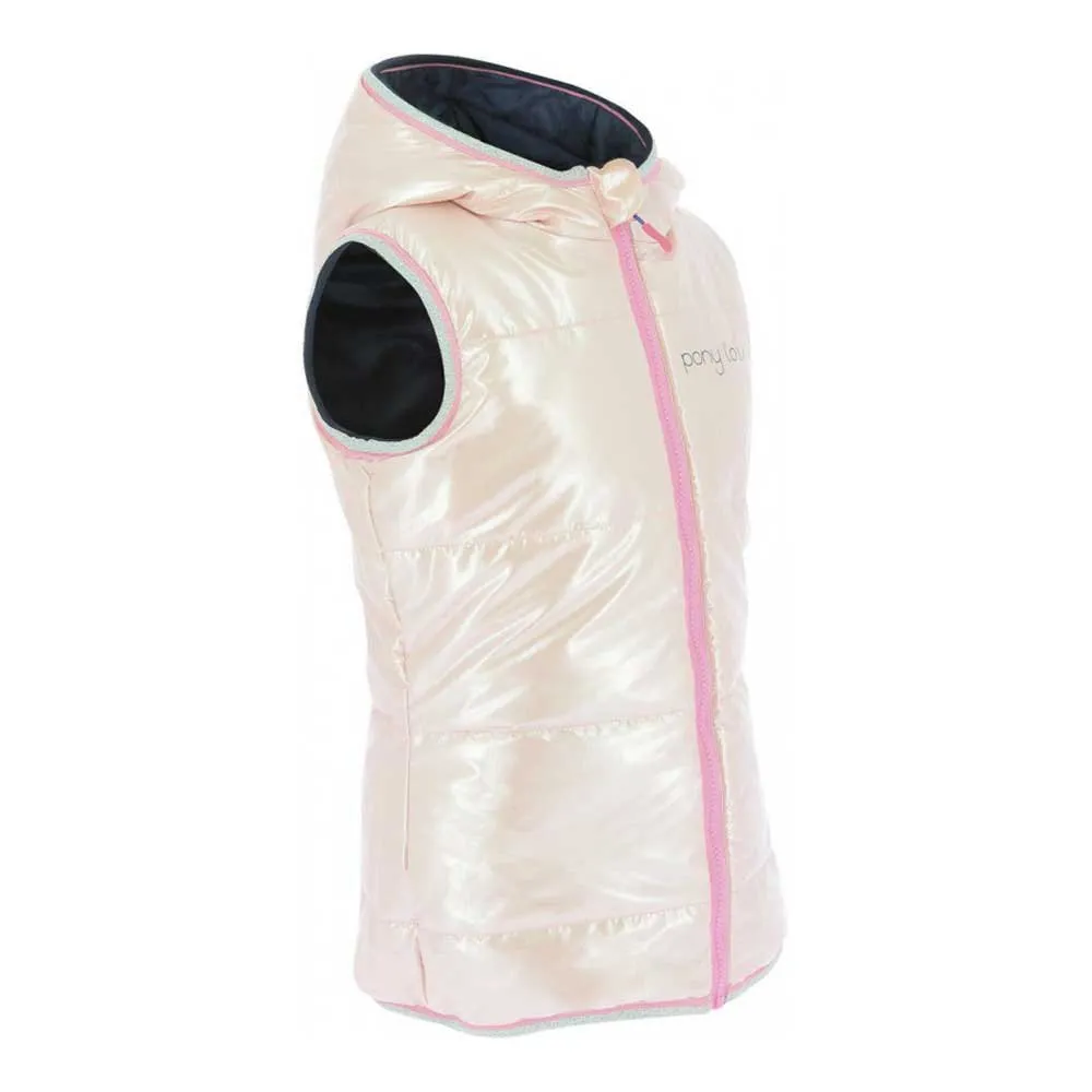 Wendbare, wattierte Weste mit Kapuze, wasserabweisend und warm. PonyLove-Markierung auf beiden Seiten. Taschen auf der marineblauen Seite. Gummizug um die Kapuze und den Saum der Jacke für besseren Schutz vor Kälte.