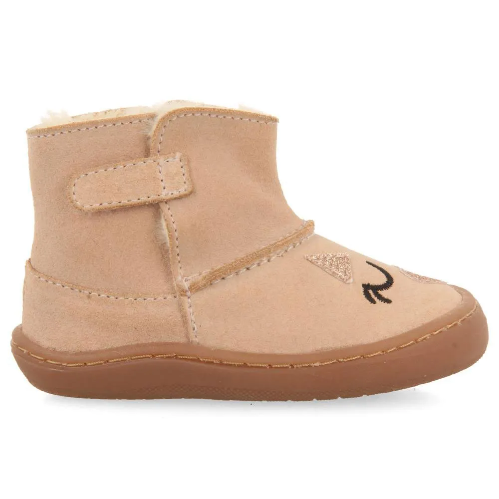 Pinke Stiefeletten mit Stickerei und verstellbaren Verschlüssen ohne anatomische Elemente, die die optimale Entwicklung des Fußes behindern könnten.