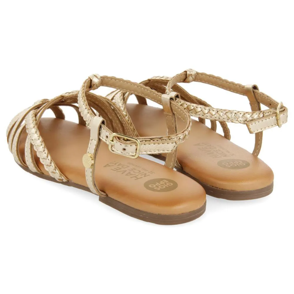 Metallisierte goldfarbene Ledersandalen mit mehreren Riemen und einigen geflochtenen Riemen.