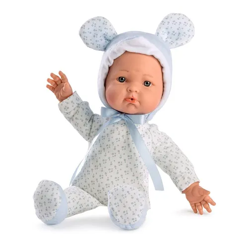 Ihr Körper besteht aus weißem Piqué-Stoff mit blauen Fußabdrücken, blau-weißen gestrickten Füßen.