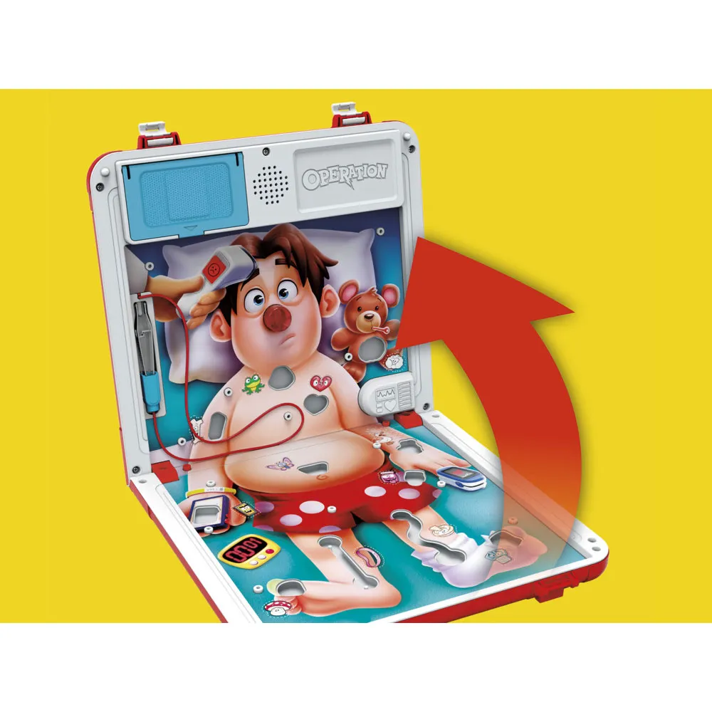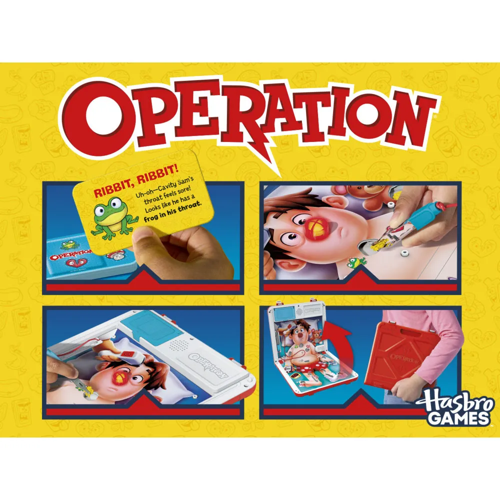 BZZZT! Das klassische Spiel Operation erhält ein aufregendes modernes Update! Teste deine ruhige Hand mit zwei Spielmöglichkeiten. Im klassischen Krankenhaus-Modus ziehst du Karten, um Sams verrückte Leiden zu entfernen. Oder tritt im hektischen, schnellen Notfall-Modus gegen die Uhr an! Sei vorsichtig – ein kleiner Fehler und Sams Nase leuchtet auf, oder er reagiert mit lustigen Rülpsern und Schreien. Mit einem neu gestalteten Sam und herausfordernden neuen Hohlräumen lässt sich das gesamte Spielbrett zu einer tragbaren Arzttasche mit integriertem Stauraum zusammenfalten, was es perfekt für Spaß unterwegs macht. Kannst du den Patienten heilen und gewinnen?