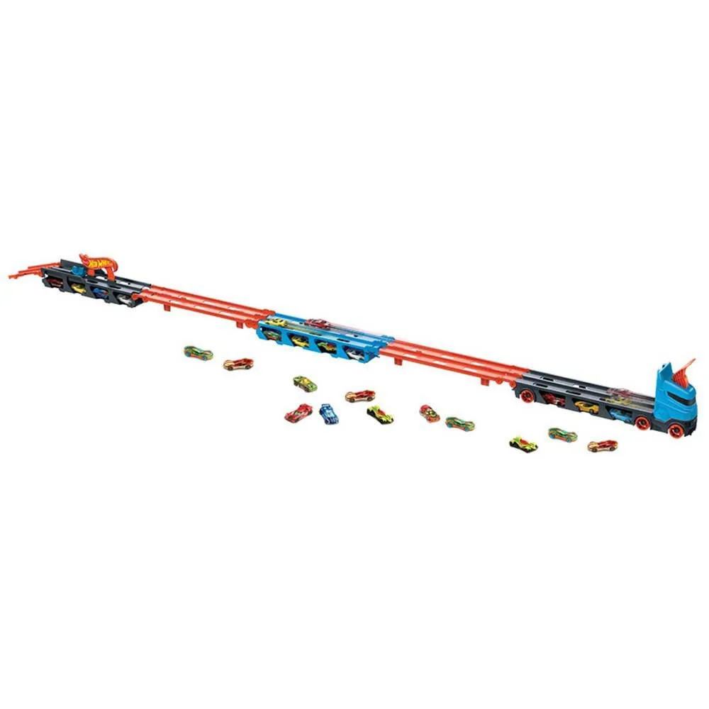 Der Hot Wheels® Track and Transport Truck definiert die Hot Wheels® Aufbewahrung und das Rennen mit einem unglaublichen Truck voller Überraschungen neu.