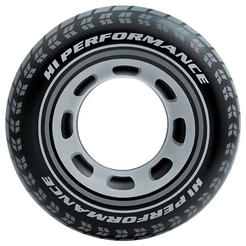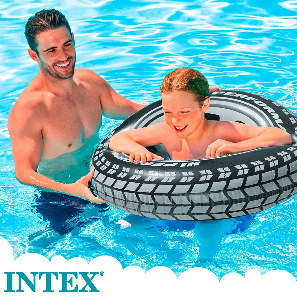 Aufblasbarer Reifen vom Typ Intex Float mit einem Durchmesser von 91 cm (79 cm Innendurchmesser) aus hochwertigem Vinylmaterial mit einem schwarzen Design, das einem echten Reifen ähnelt.