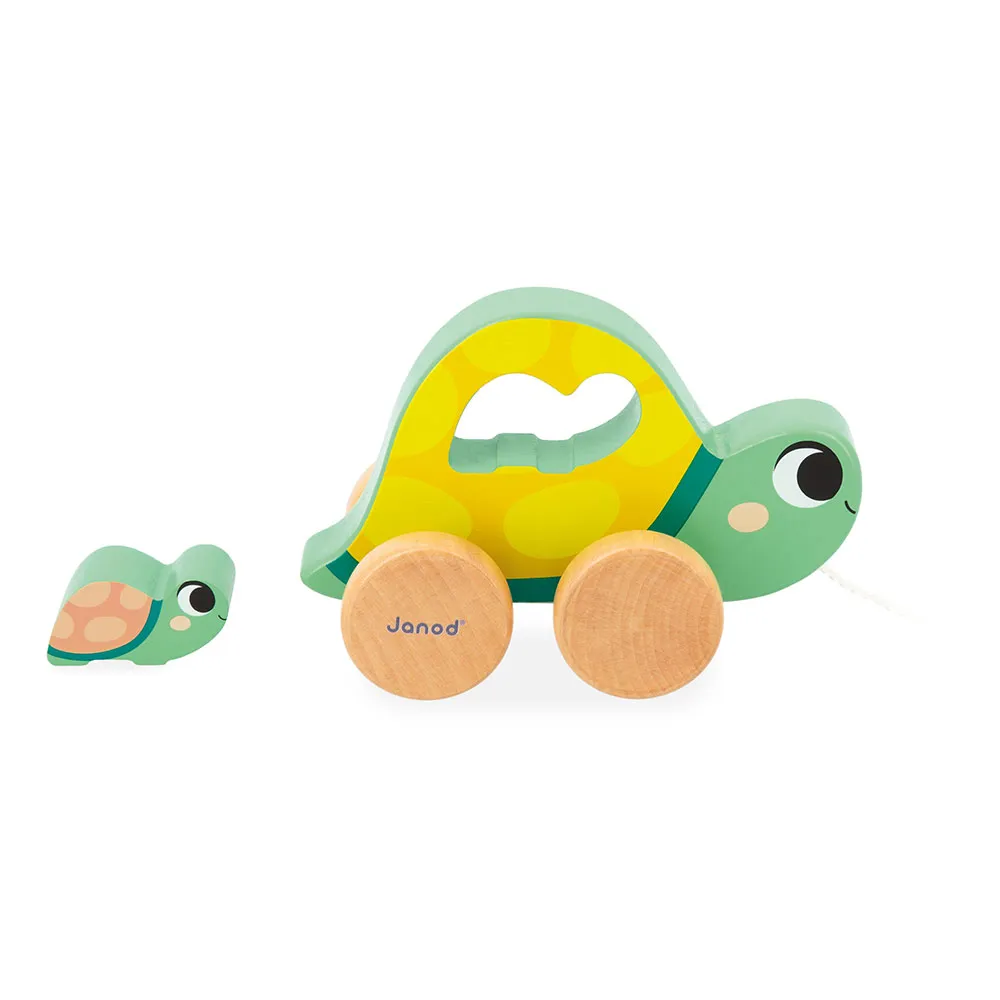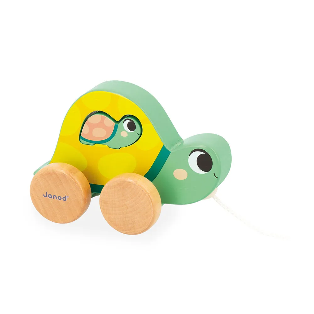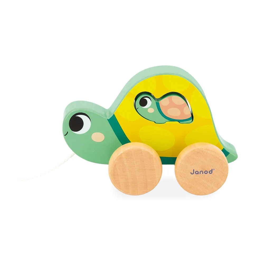 Der Inhalt umfasst eine ziehbare Mutter-Schildkröte mit ihrem kleinen Baby, 6 Fisch-förmige Fädelperlen, einen musikalischen Wecker und ein 4-teiliges Puzzlespiel.