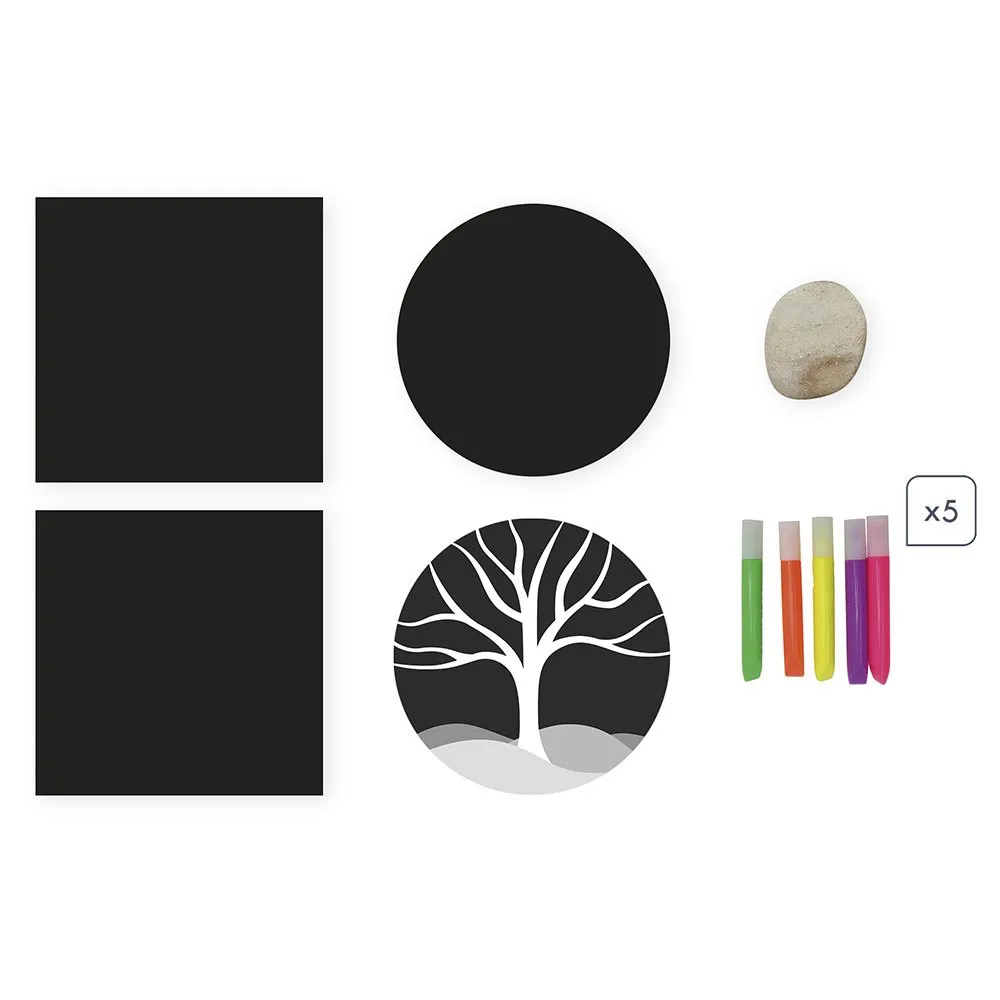 Erwecken Sie schwarze Quadrate zum Leben und färben Sie sie dank des Pointillismus-Trends! Mit diesem Koffer können Sie 4 schwarze Quadrate und einen Felsbrocken mit 3D-Farbpunkten unterschiedlicher Größe dekorieren.