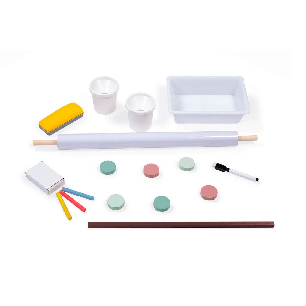 Eine magnetische Markierungstafel für löschbare Markierungen und eine Tafel. Verschiedene Zubehörteile: 6 Magnete, 10 Kreidestücke, 1 trocken löschbarer Marker, 1 Papierrolle, 1 Radiergummi und 1 magnetisches Lineal. Einstellbare Höhe (91 bis 126 cm 35,8 bis 49,6 Zoll). Schreibfläche: 47 x 47,5 cm (18,5 x 18,7 Zoll). Sehr praktisch: Die Tafel lässt sich zur einfachen Aufbewahrung zusammenklappen. Holz: MDF (Tafel), Kiefernholz (Rahmen, Magnete, grünes Regal, Lineal), Kunststoff (Tassen, Radiergummi, Stift).