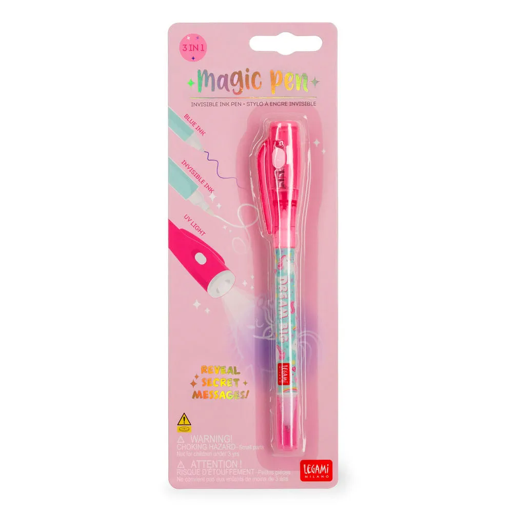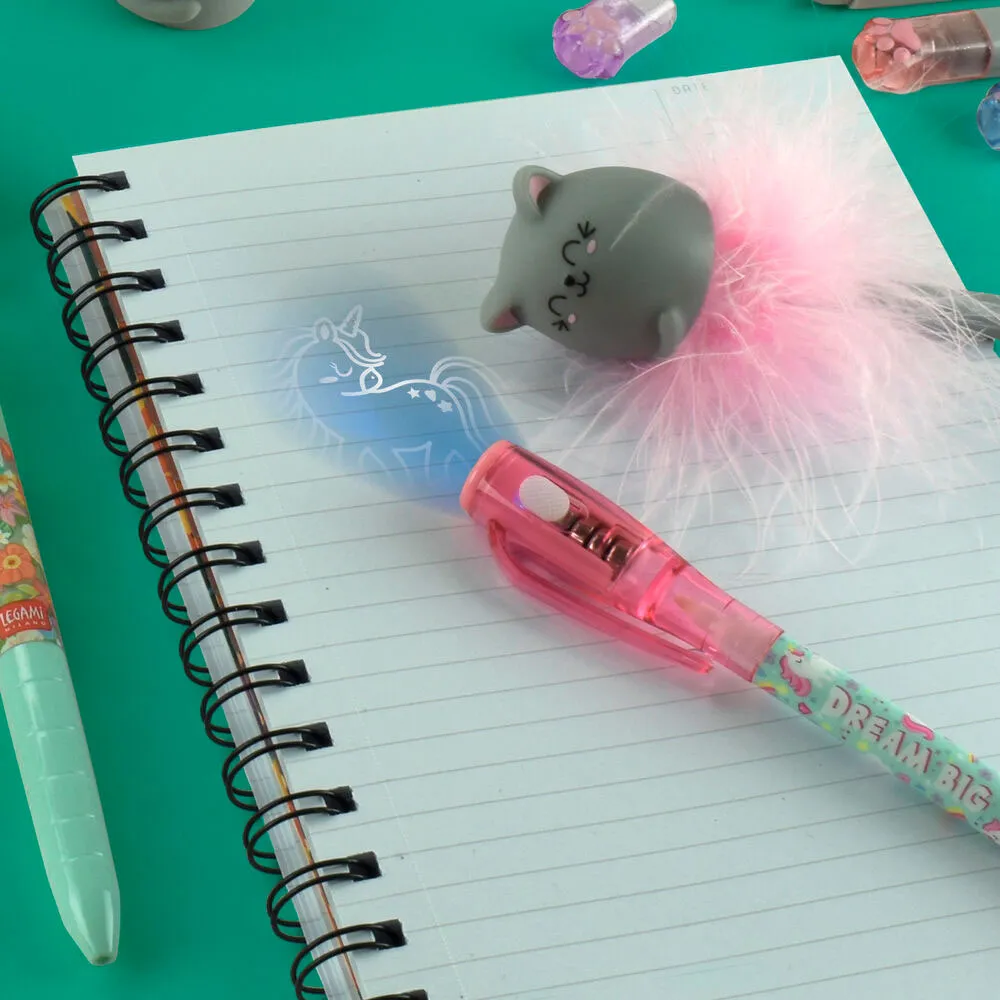 Versteckt vor aller Augen – das ist das Geheimnis des Einhorn-Zauberstifts mit unsichtbarer Tinte von Legami. Dank der Doppelspitze kannst du mit klassischer blauer Tinte schreiben und dann im Handumdrehen in den Spionagemodus mit der unsichtbaren Tinte wechseln. Nur mit dem speziellen UV-Licht auf dem Deckel wird das Geschriebene sichtbar. Perfekt für Liebesbriefe, geheime Botschaften mit deiner besten Freundin und Notizen für Klassenarbeiten. Der Lehrer wird nichts ahnen.