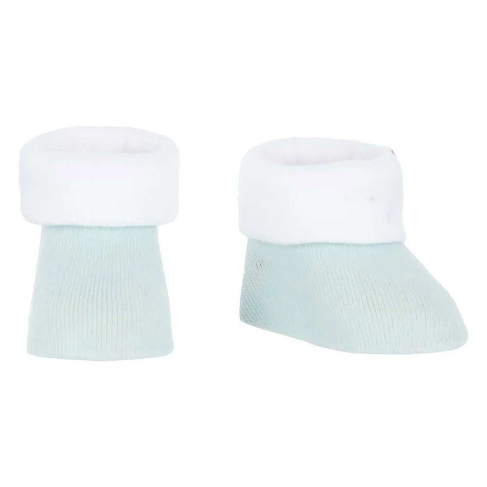 Es umfasst einen Kurzarm-Bodysuit aus weichem Baumwoll-Rippstrick, der sich weich auf der Haut anfühlt, mit überlappenden Schultern und Druckknöpfen im Schritt zum einfachen Wechseln und Anziehen, und die passende Mütze und Stiefeletten haben kontrastierende Bündchen für einen bequemen, koordinierten Look.