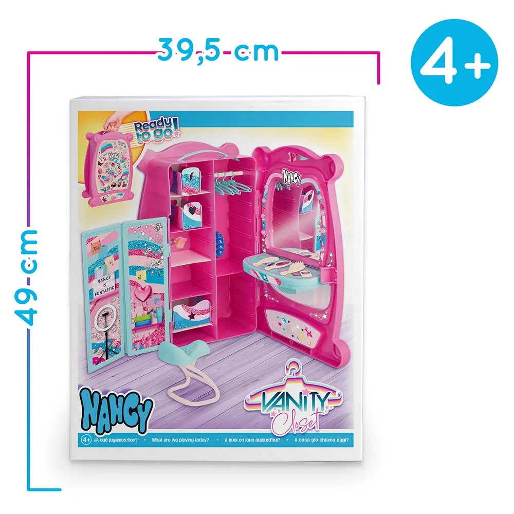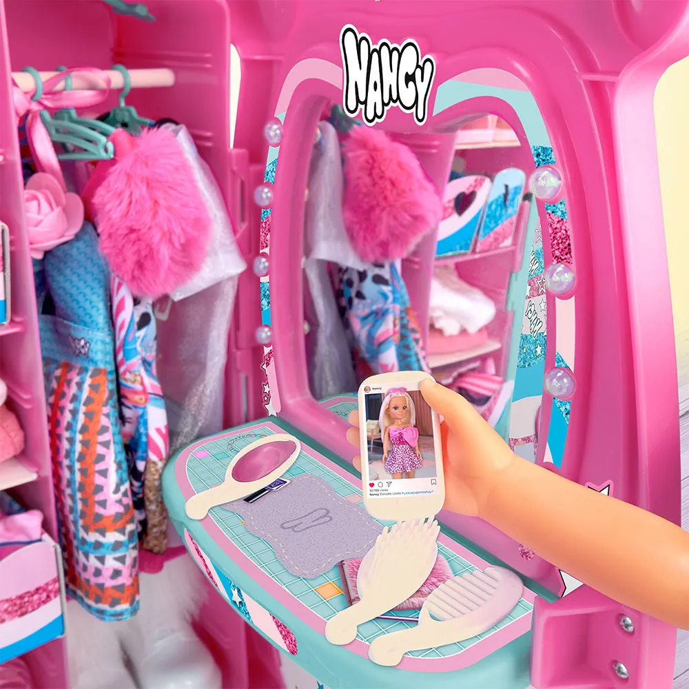 Set beinhaltet: 1 Nancy Puppe, 1 tragbarer Ankleideschrank, 3 komplette Modeoutfits und eine große Auswahl an Accessoires, darunter Schuhe, Handtaschen und mehr.