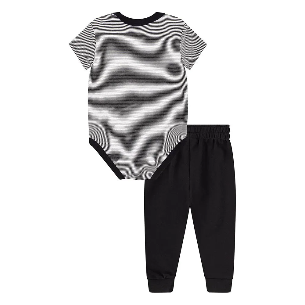 Das NIKE KIDS Striped Set in Schwarz ist ein stylisches und bequemes Kleidungsset für Kinder. Das Set besteht aus einem langärmeligen Sweatshirt mit Rundhalsausschnitt und einer passenden Jogginghose, die beide mit einem modernen schwarz-weißen Streifendesign versehen sind. Dieses Set aus weichem und strapazierfähigem Material eignet sich perfekt für den Alltag oder für Freizeitaktivitäten. Das Sweatshirt hat einen gerippten Kragen, Bündchen und Saum für eine sichere Passform, während die Hose mit einem elastischen Bund und gerippten Bündchen für zusätzlichen Komfort ausgestattet ist. Dieses NIKE Kids Striped Set wird Ihrem Kind den ganzen Tag über ein cooles Aussehen und ein gemütliches Tragegefühl verleihen.