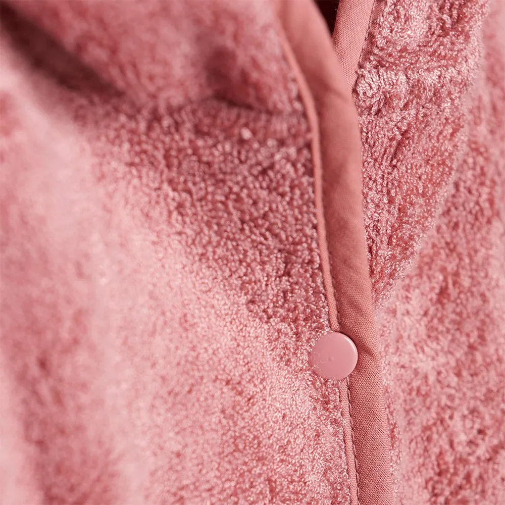 Er ist einfarbig und hat einen praktischen abnehmbaren Frotteegürtel, der vorne gebunden werden kann, sowie einen Druckknopf für einen besseren Verschluss.