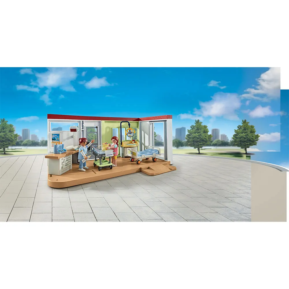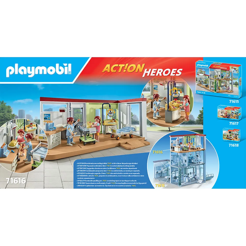 Auf der Geburtsstation wird für das Wohl der Mütter und ihrer Kinder gesorgt. Der Name des jüngsten Familienmitgliedes kann auf das Schild am Babybett geschrieben werden, und eine Waage steht bereit, um das Gewicht zu überprüfen. Dieses Set lässt sich modular an das Moderne Krankenhaus (71615) anbauen. Die PLAYMOBIL Action Heroes Krankenhauswelt lädt Mädchen und Jungen dazu ein, das Leben in einem modernen Krankenhaus kennenzulernen und sich spielerisch mit Themen wie Pflege, Behandlung und Krankheit auseinanderzusetzen. Das 62-teilige Spielset enthält 3 PLAYMOBIL-Figuren, ein Krankenhausbett, einen Wickeltisch und viele weitere Extras für fantasievollen Rollenspielspaß.