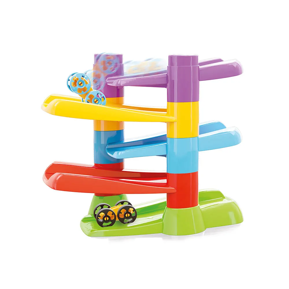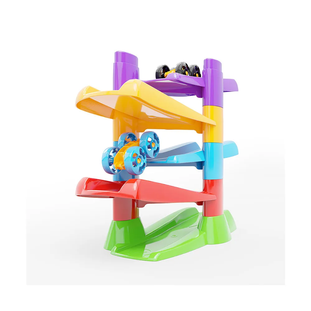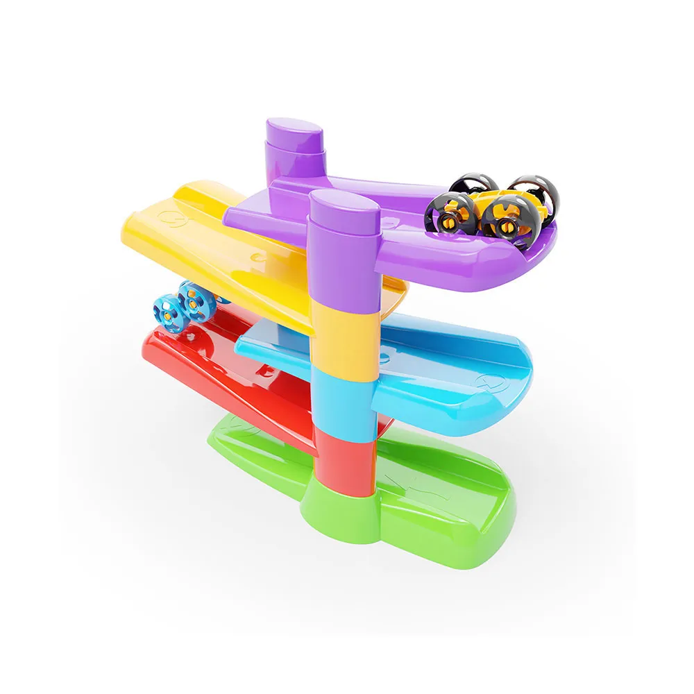 Die Magie dieses Spielzeugs liegt in seinem innovativen Design. Während die speziell entwickelten Autos die lebhaften, mehrstufigen Rampen hinuntersausen, vollführen sie am Ende jedes Abschnitts einen spektakulären Salto und landen nahtlos auf der nächsten Ebene darunter, um ihren Abstieg fortzusetzen. Diese kontinuierliche Überschlagbewegung ist für die Kleinen endlos faszinierend, fesselt ihre Aufmerksamkeit und führt sie gleichzeitig in grundlegende Konzepte von Ursache und Wirkung ein. Kinder werden staunend zusehen und dabei wichtige visuelle Verfolgungsfähigkeiten entwickeln, während ihre Augen der aufregenden, der Schwerkraft trotzenden Reise der Autos von oben nach unten folgen.