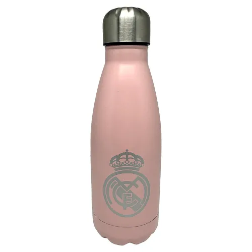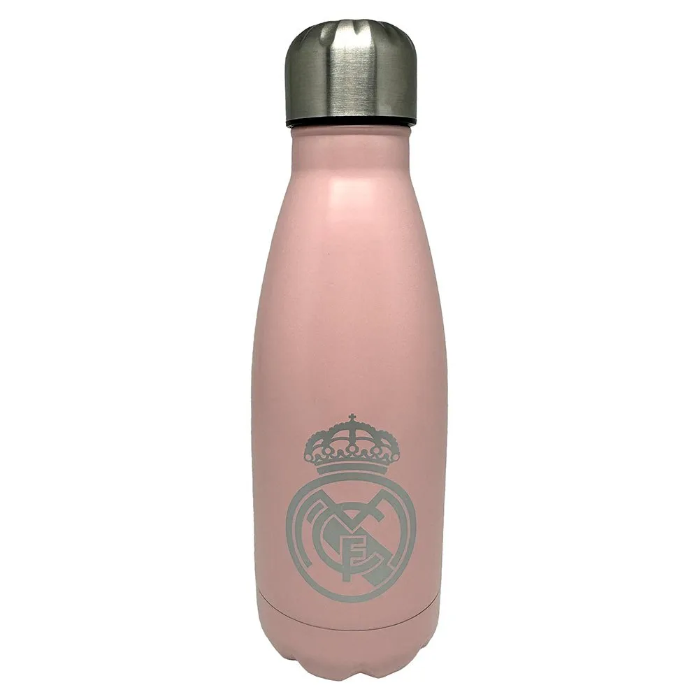 Pinke Stahlflasche mit dem monochromen silbernen Real Madrid-Wappen.