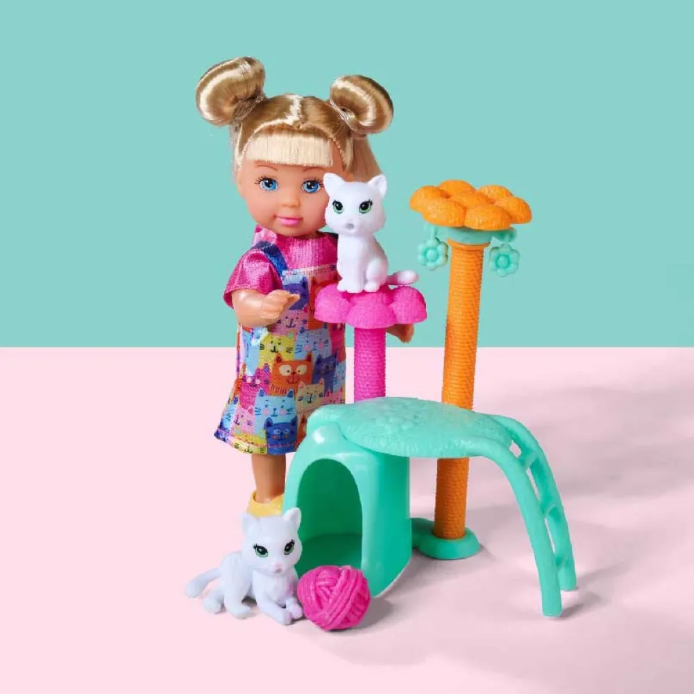 Evi trägt ein süßes Kleid mit Katzenmuster, inklusive Kratzbaum, zwei Katzenfiguren und viel Zubehör zur Pflege ihrer pelzigen Freunde.