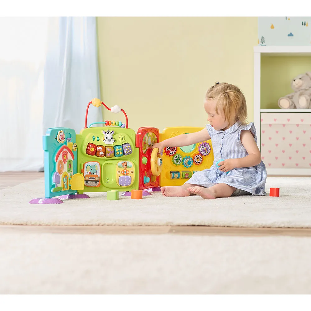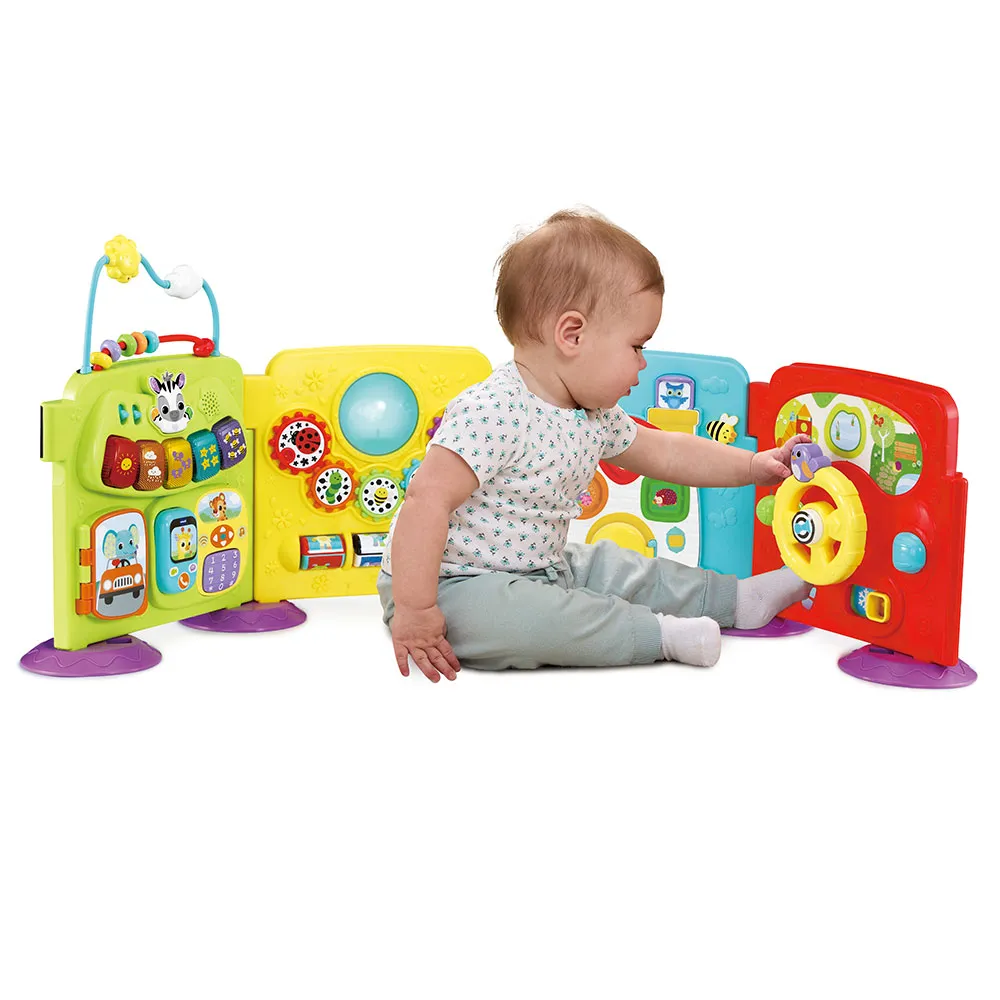 Vier überraschungsreiche Paneele wachsen mit Ihrem Kleinen mit und können miteinander verbunden oder separat verwendet werden, wobei sie dank stabiler Stützen immer aufrecht stehen.