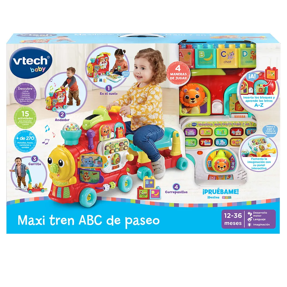 Bist du bereit, loszufahren? Chuggen wir zusammen in das Lernvergnügen mit dem Maxi Tren ABC de Paseo von VTech! Dieser 4-in-1 Grow with me Alphabet Zug beinhaltet Modi für das Sitzen, Gehen, Zurückziehen und Reiten. Der Zug beinhaltet 13 doppelseitige Buchstabenblöcke und einen magischen Tunnel, um die Blöcke in den Wagen zu laden. Du kannst auch die Blöcke auf der Innenseite des Wagens stapeln und die Blöcke hinunterrutschen lassen! Es enthält auch ein abnehmbares Aktivitätspanel, eine leuchtende Nummerntastatur, ein drehendes Buch und manipulative Zahnräder. Es lehrt Objekte, Tiere, Phonik, Farben, Zahlen und vieles mehr. Es enthält 3 Mitsinglieder und 10 Melodien. Es ermutigt Entdeckung und Erkundung, Sprachentwicklung und Motorik.