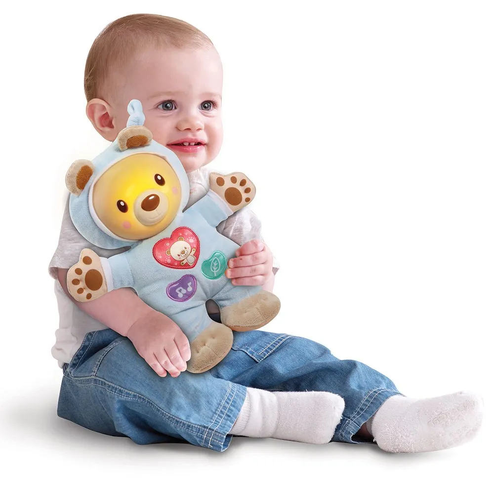 Mit einem quietschigen Körper, weichen, flauschigen Füßen und Pfoten für taktile Stimulation und einem weichen, leuchtenden Licht mit zwei Einstellungen, die Babys beruhigen.