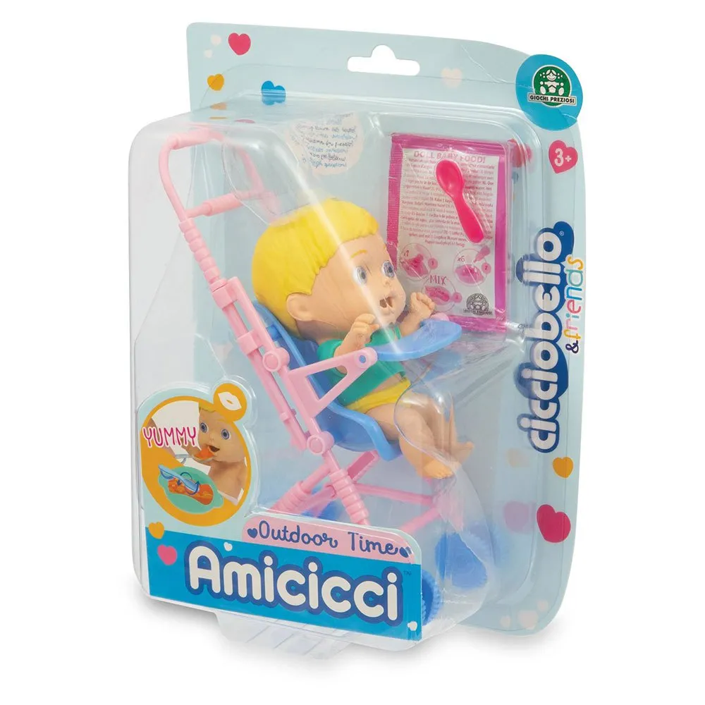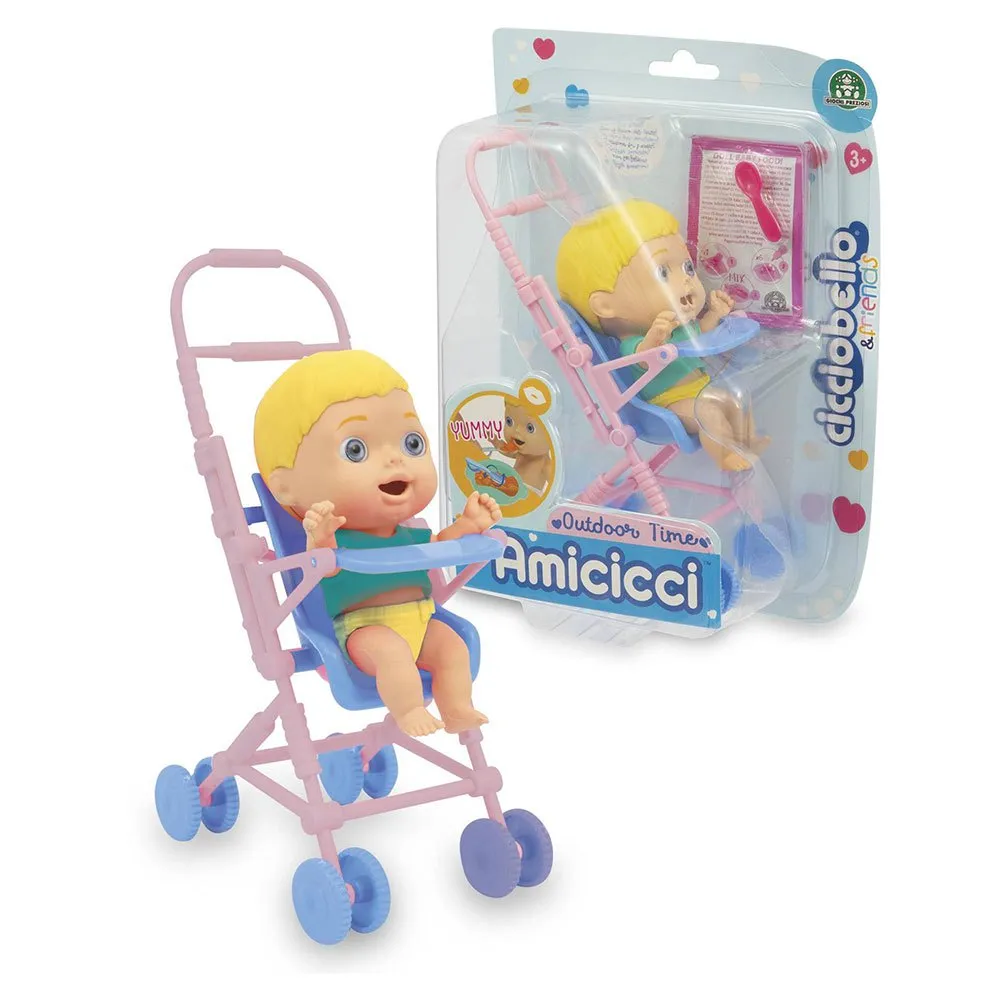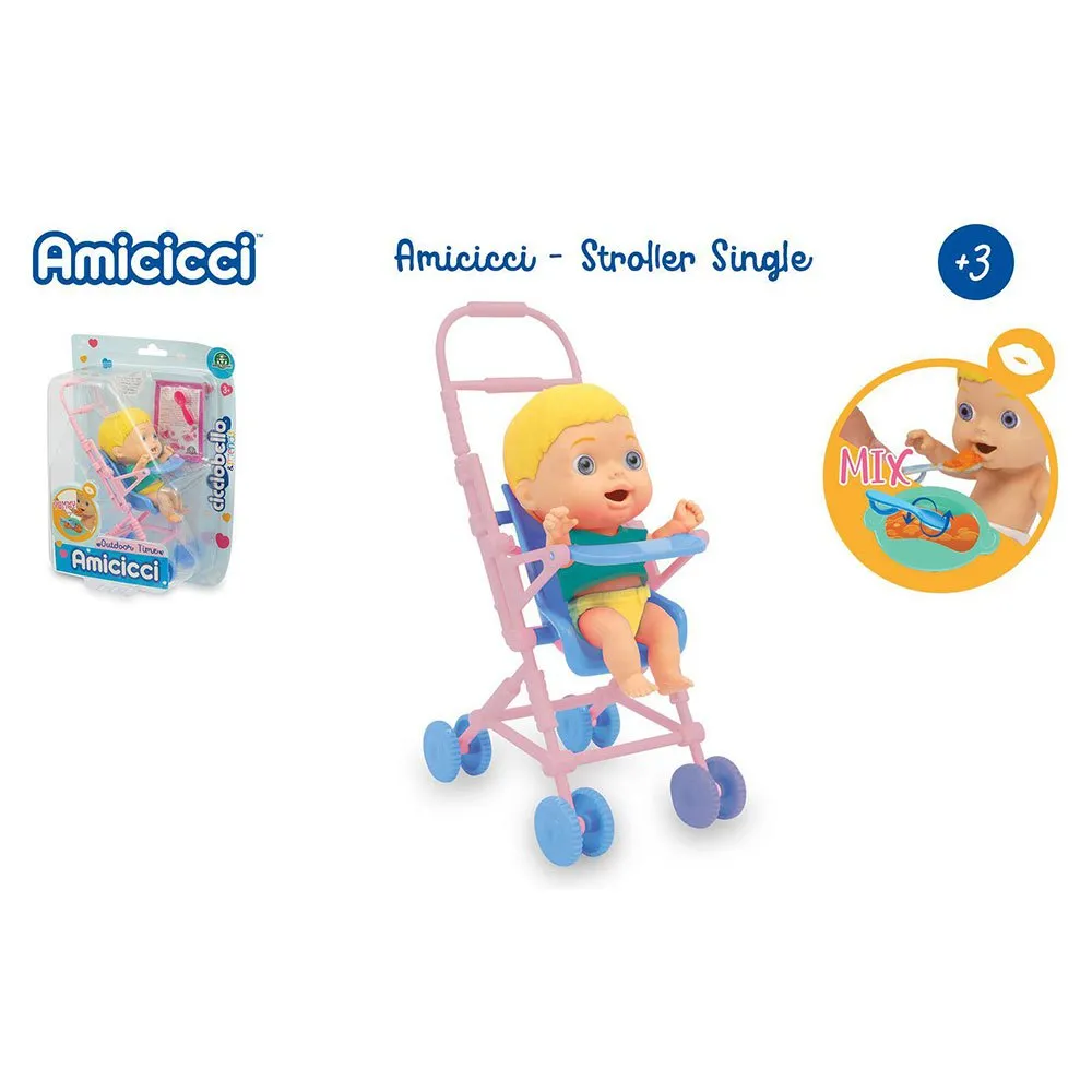 Amicicci stroller single includes a blond amicicci doll dressed in a removable and interchangeable diaper and t-shirt and a pink and blue stroller with movable wheels so you can take it anywhere.