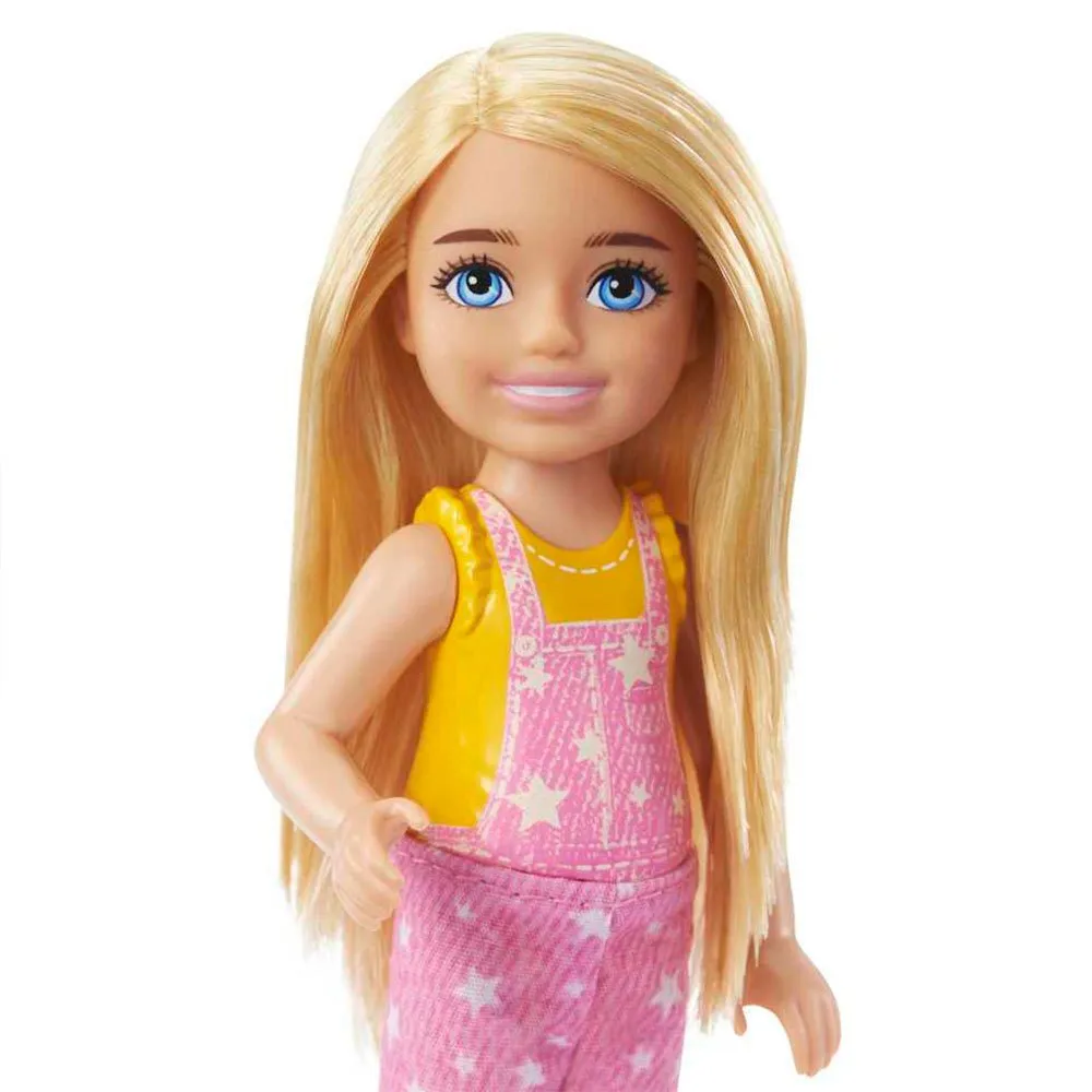 - Chelsea™ doll is ready for all-day play in pink overalls and a pair of sporty hiking boots.