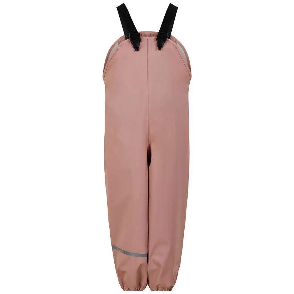 Durable pu rainwear pants in recycled polyester with bib, adjustable suspenders and click buckles.