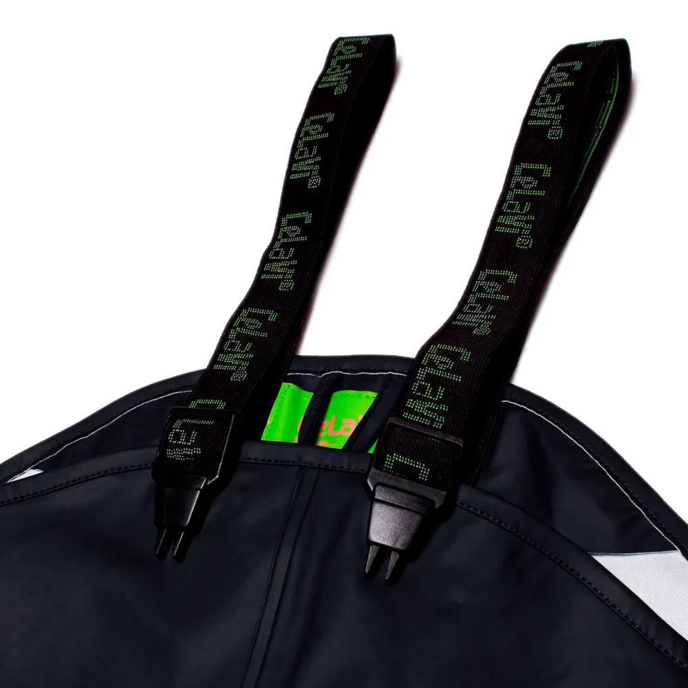 In size 110-150, though in some colors up to 170, the rainpants come with elastic waistband (size 110-140) and only celavi logo on chest and leg.