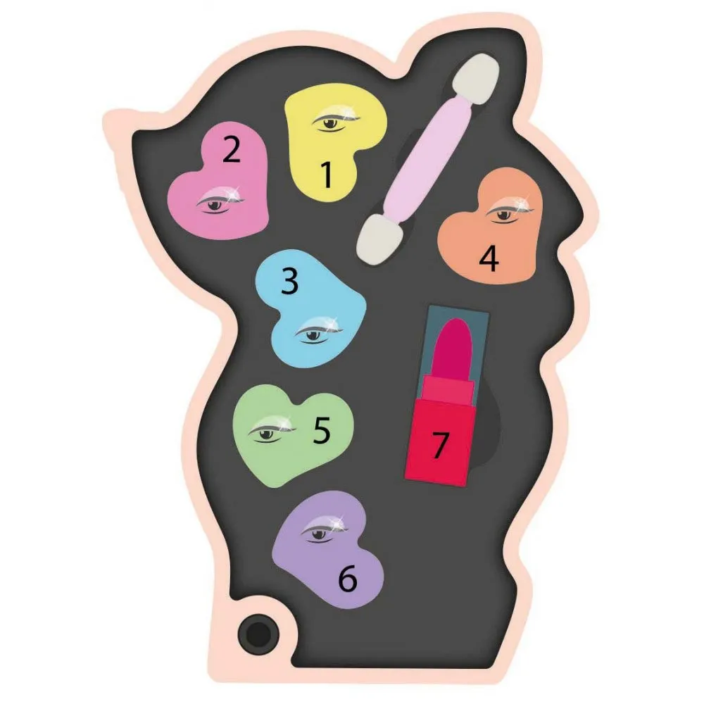 A vivid and bright color palette, with 6 eye shadows, 1 lipstick and an applicator.