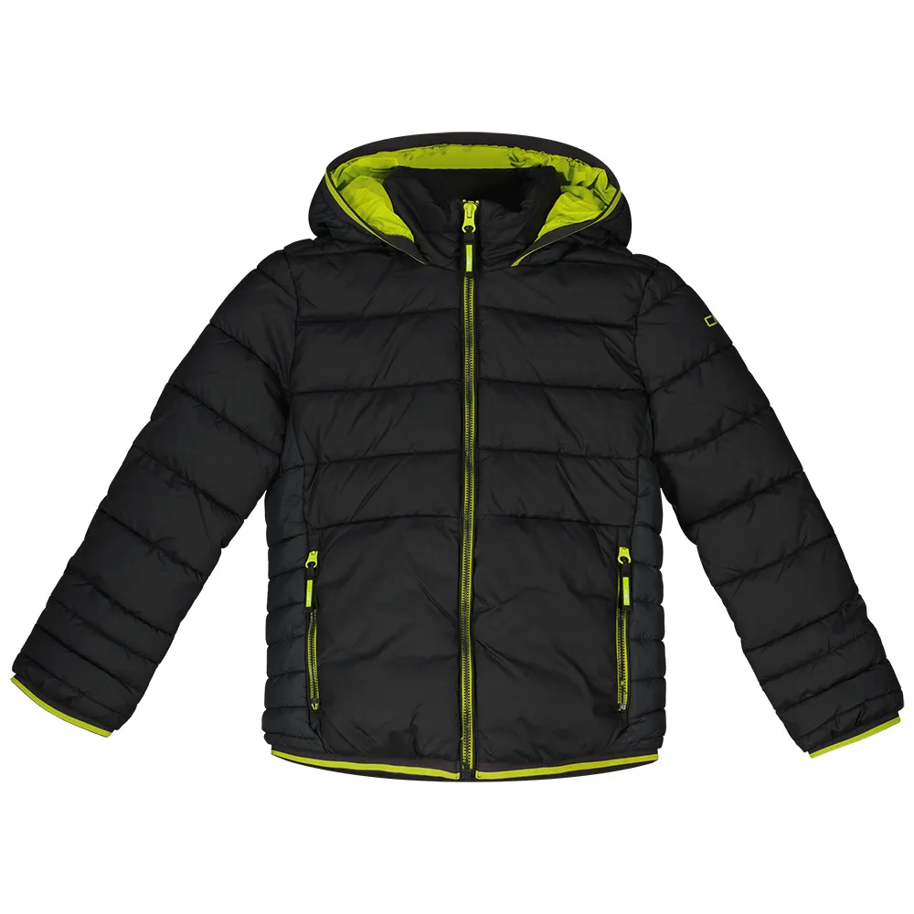 Padded jacket with geometric pattern and Feel Warm Flock synthetic fiber, insulating, lightweight, and compact.