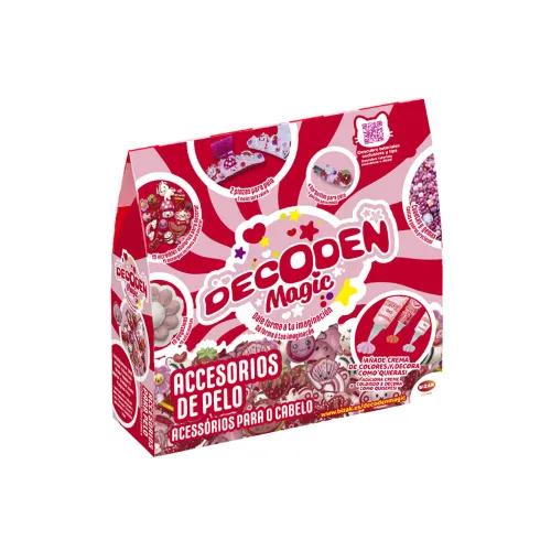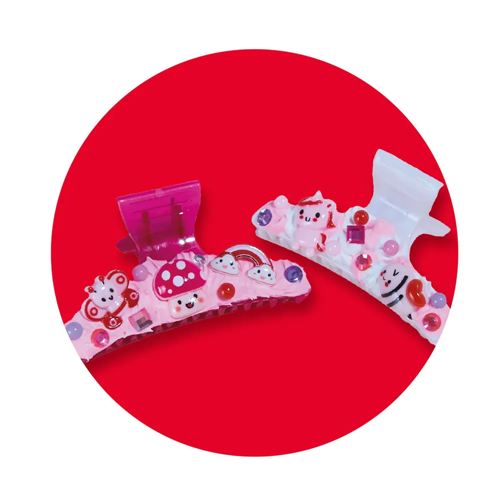 3 decoden bottles, 3 nozzles, 15 charms, 75 beads, 50 gems, 1 tweezer, 10 stickers, 4 hairpins and 2 hair clips.
