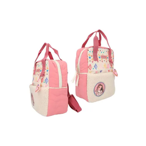 Cuddly-cool: The TOPModel backpack in delicate antique pink and with trendy quilted details has a front pocket made of fluffy beige teddy fake fur. Features a small round model applique, a colourful patterned front, a cute colourful heart charm, two carry handles, adjustable length shoulder straps and a carabiner inside. Main material: 100 percent recycled polyester; inside 100 percent polyester.