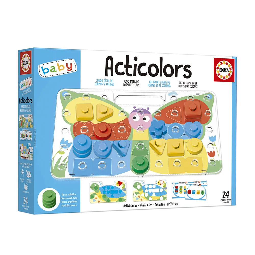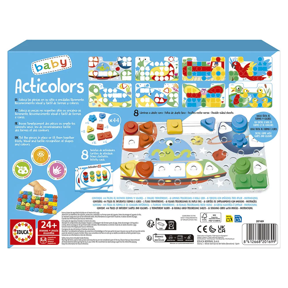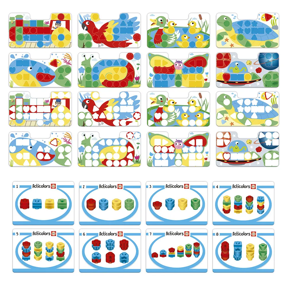 - 1 plastic base with handle - 12 sheets - 44 pieces of 6 different shapes and colors.