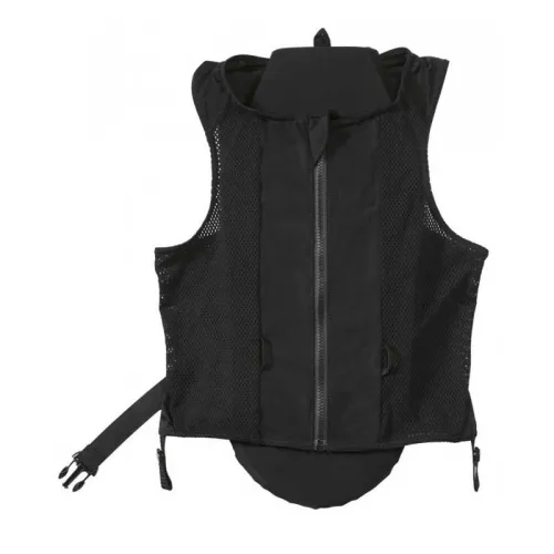 Back protector comprising a zip-fastened vest in 85% polyamide and 15% polyester padded with several layers of light and supple high density foam, fitted with an elastic adjustment belt. Detachable cover, hand washable: polyester. Padding in high density foam. NB Complies with the BS EN 1621-2:2014 Level 2 Motorcyclists´ protective clothing against mechanical impact - Part 2 : motorcyclists´ back protectors - Requirements and test methods. The fact that it is intended for motorcycling does not mean that it cannot be used for equestrian sports, but it cannot replace a body protector tested and approved to the EN13158:2018 Standard, which is meant for equestrian sports.