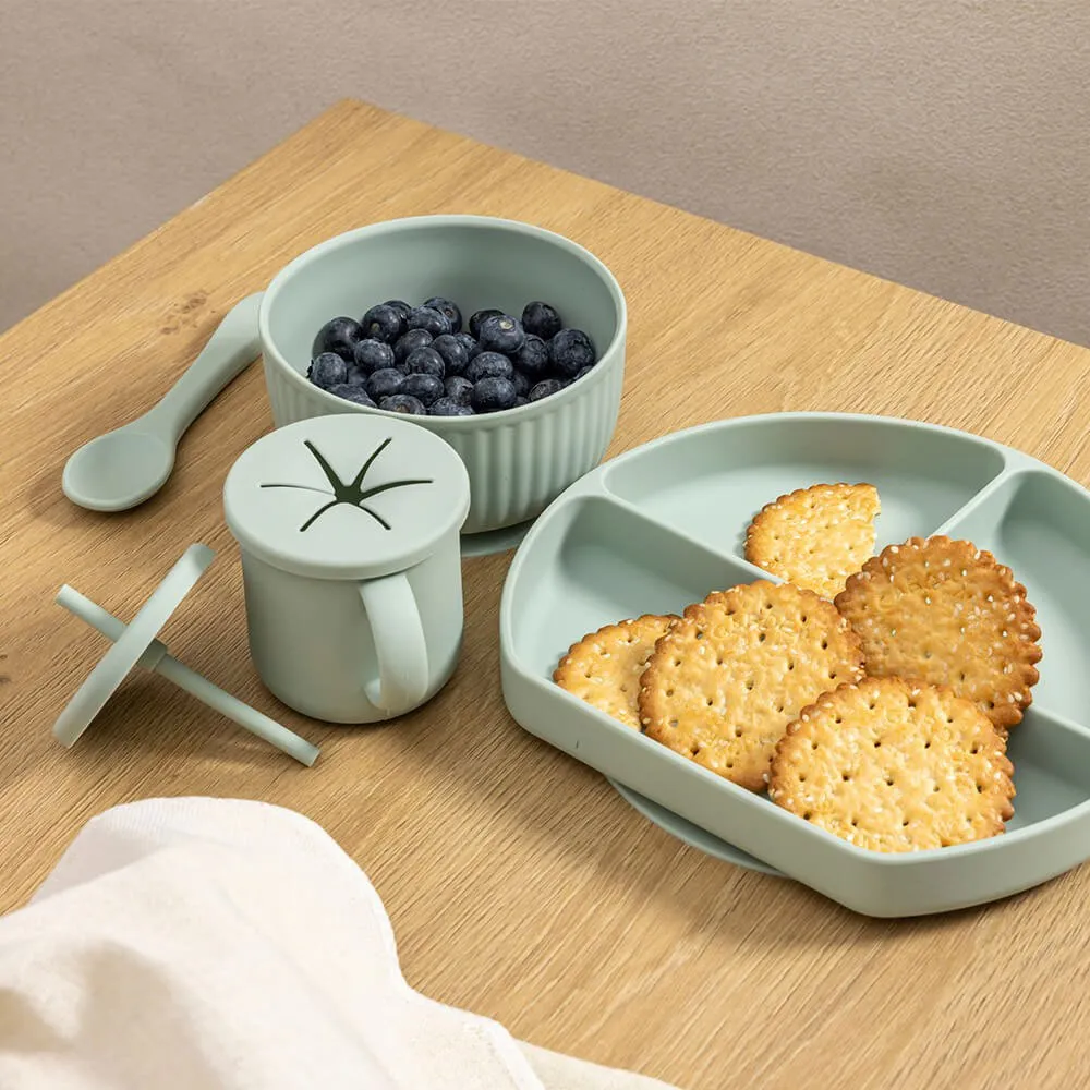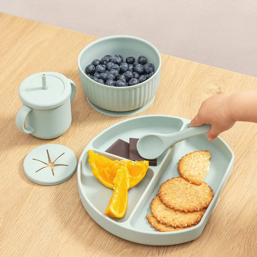 This is achieved thanks to the silicone bowl and plate base, which adhere securely to any smooth surface, such as tables or high chair trays.