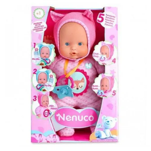 Soft doll with functions for a sensory experience adapted to the little ones, if you squeeze his hands he says pa-pa or ma-ma, if you squeeze his tummy he will laugh.