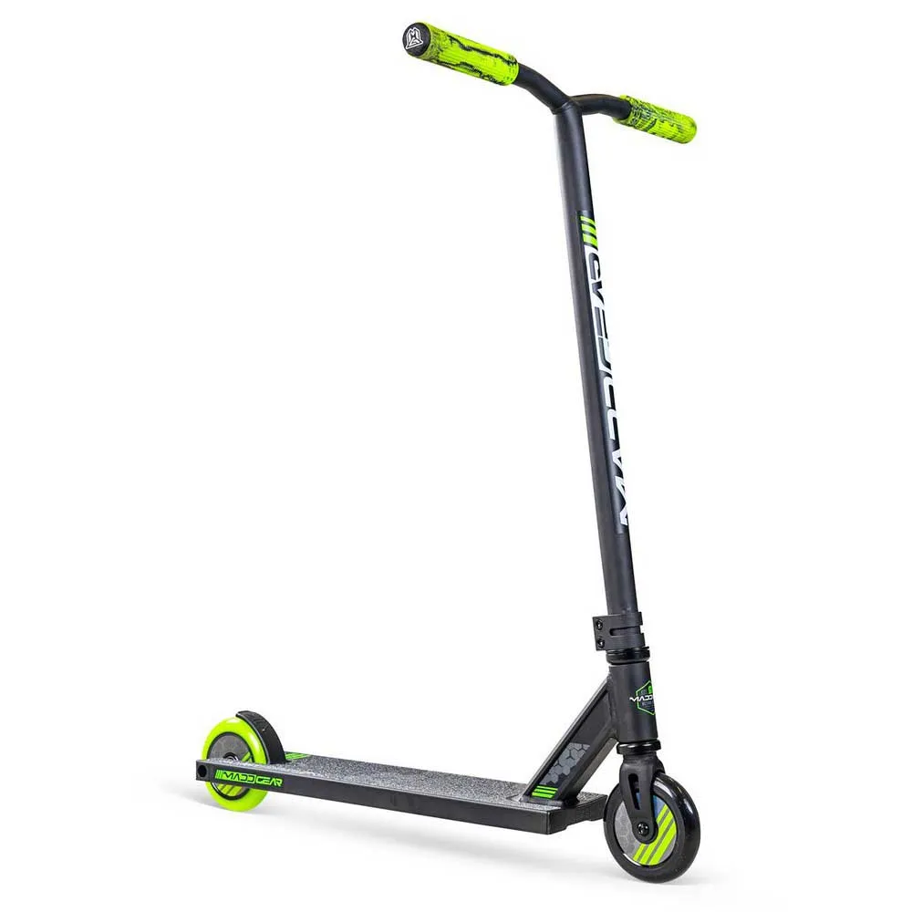 Madd Gear MG3 Zen Pro Scooter - Get ready to shred your local skatepark! The Madd Gear MG3 Zen Pro Scooter is designed to be the ultimate ride for kids ages 8 and up who are ready to shred at their local skatepark. Whether you´re learning your first tricks or honing your skills, this scooter is built tough to handle everyday stunts. With its high-quality extruded aluminum deck and strong one-piece steel handlebars, the MG3 Zen Pro scooter is lightweight yet durable and can support riders up to 220 lbs. It´s built to withstand daily use at the skatepark, so you can focus on landing tricks instead of worrying about your gear. Glide smoothly on 110mm 88A composite hollow-core wheels and ABEC-7 precision bearings, giving you the speed and control you need to dominate every line. From ramps to rails, this scooter is ready to go right out of the box—just slide on the handlebars, tighten the clamp with the included tool, and you´re ready to ride. The perfect entry into the exciting sport of stunt scootering, the MG3 Zen Pro scooter is ready to rip right out of the box! Recommended user weight: 100 kg / 220 lbs Recommended user age: 8 years and older GRIPS: 150mm Swirl TPR Trifecta with Bar-Ends HANDLEBAR: MG Low-Riser 23” / 58.4cm Tall x 21” / 50.8cm Wide One-Piece Steel CLAMP: MG Segment Aluminum Double FORK: Pro-Cast Steel Threadless IHC DECK: MGP Legacy Fluted Hybrid Boxed Non-Integrated 4.5” / 11.4cm Wide x 19.5” / 49.5cm Long WHEELS: 110mm 88A Composite Holographic Cores BEARINGS: ABEC-7 High-Speed Chrome BRAKE: MFX Flex-Lite Composite HEADSET: Sealed Cartridge Bearing HEADTUBE: 82.5 Degree I-Beam Extruded FINISH: Powder Coated Deck / Full Grip Print / Bottom Deck Graphic