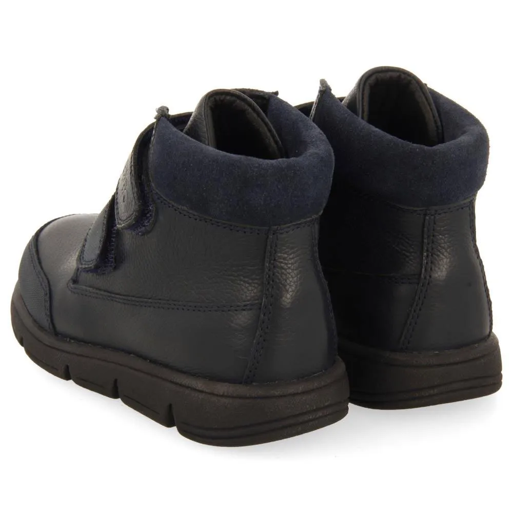 Dark blue leather school boots with adjustable closures.