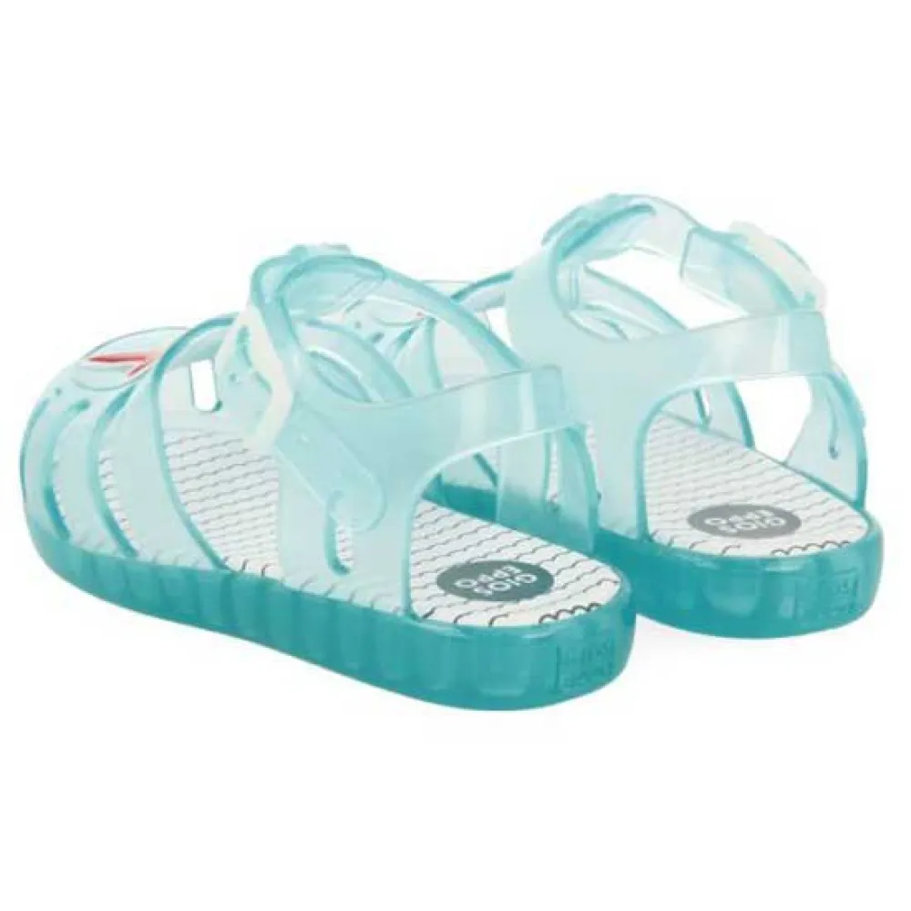 Ducks in the water! turquoise jelly shoes with a star patch on the upper.
