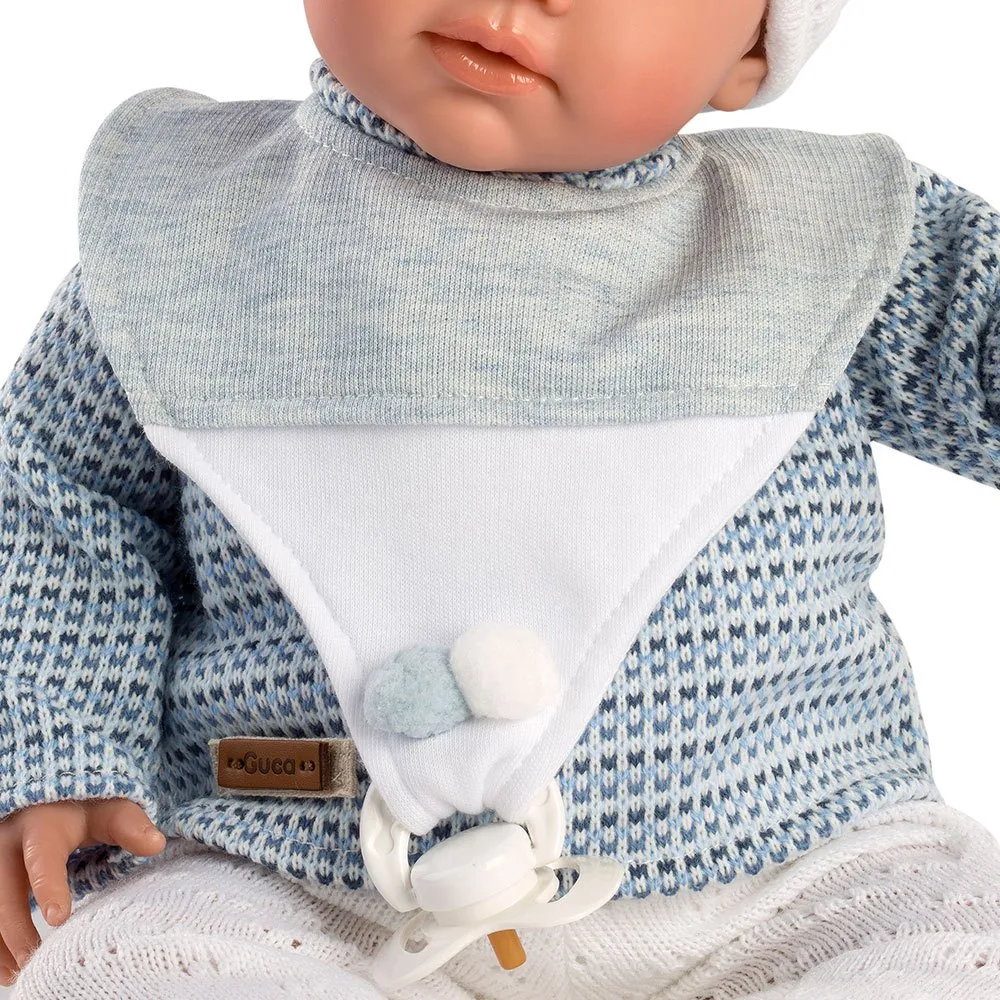 Thiago doll, has no hair, wears a wool sweater in blue tones, white leggings and wool hat, as a complement he has mittens, blue and white bib and a pacifier.