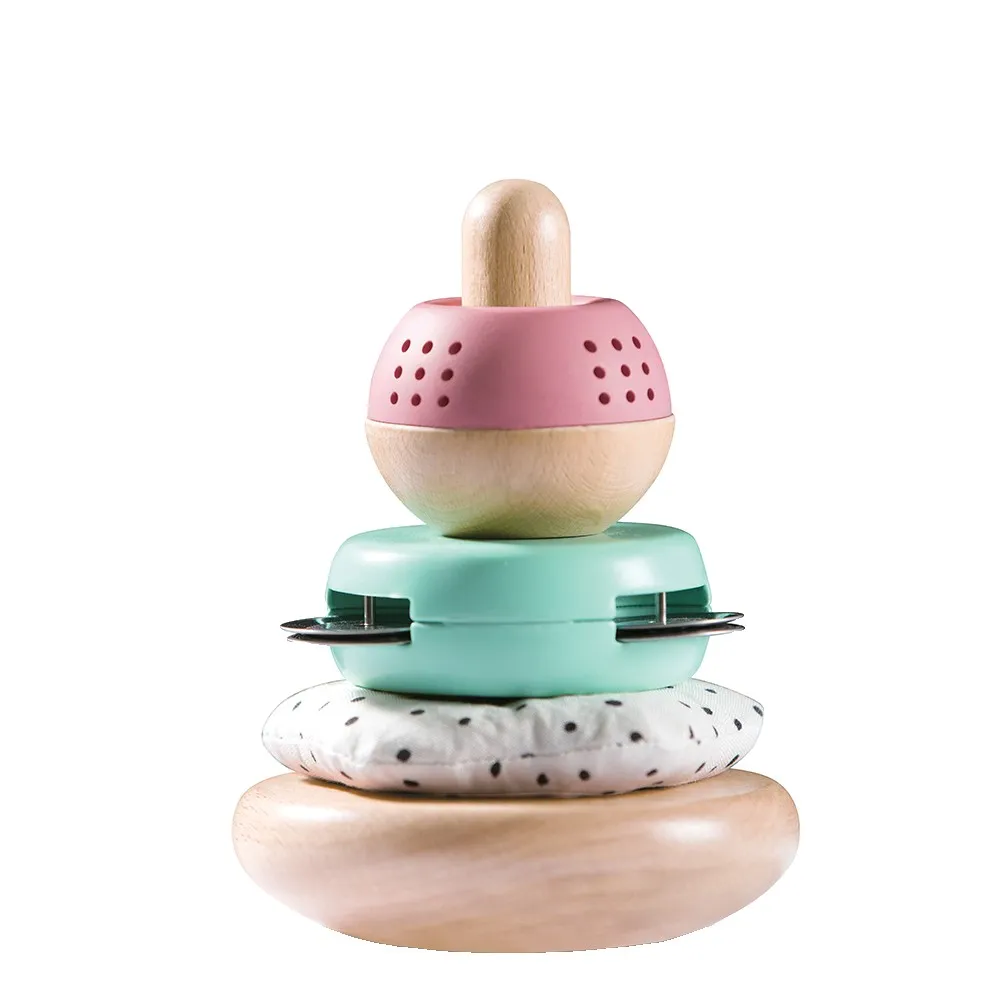 Featuring a crinkle-textured star, a tinkling mini-tambourine, and a vibrating bead ball to stack on the wobbly base!