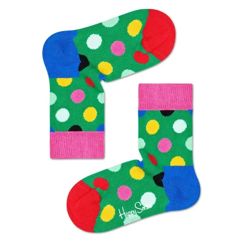 Pair of children´s high socks with a different print to improve your look with a soft fabric.The most hip socks of the moment Happy Socks! These socks are very popular thanks to their original patterns and high quality.Pair of colorful socks in the style of circles in various colors on a green background.