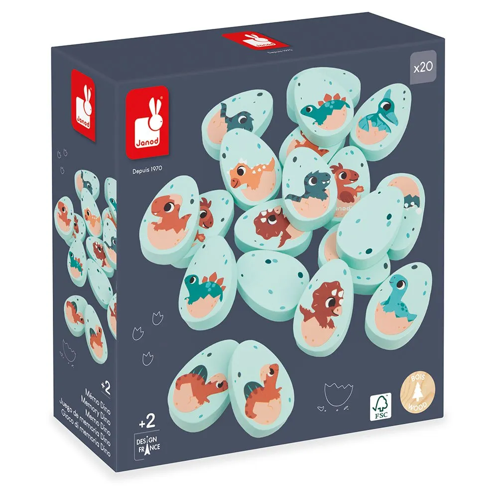 This set consists of 20 wooden eggs illustrated with different dinosaurs.