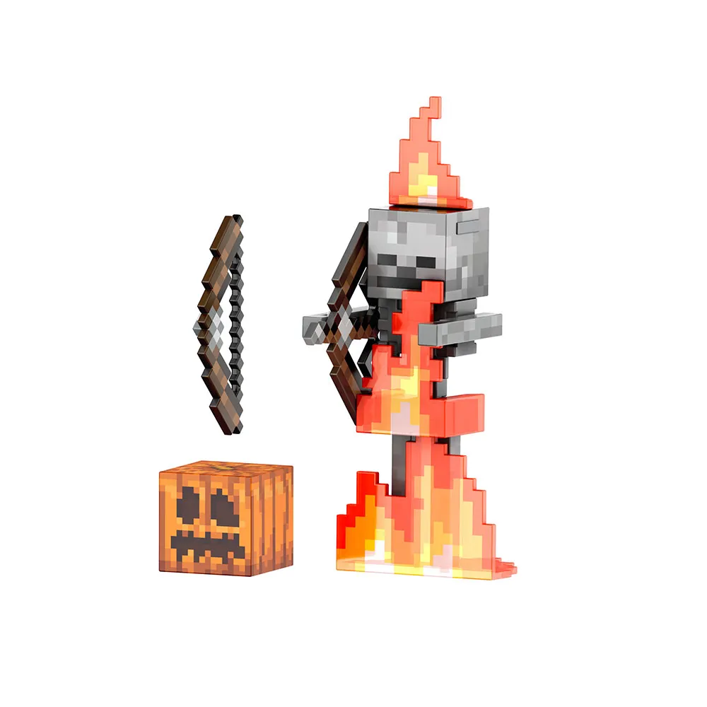 In addition, there is a carved pumpkin helmet that is scented! The Skeleton, perfect for display, is articulated and faithfully reproduces the characteristic pixelated design of Minecraft.