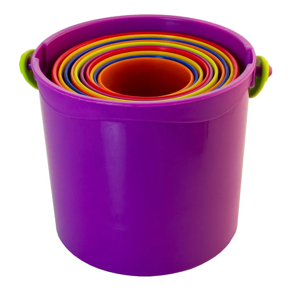 Our classic Giantte, Stacking cups. Each cup has a number in relief – making it easy to stack in order. The bucket has a perforated lid with the silhouettes of 4 different shapes to match and insert 4 included shape blocks through the lid.