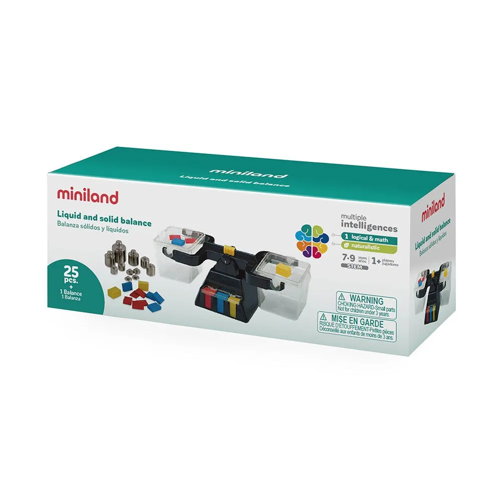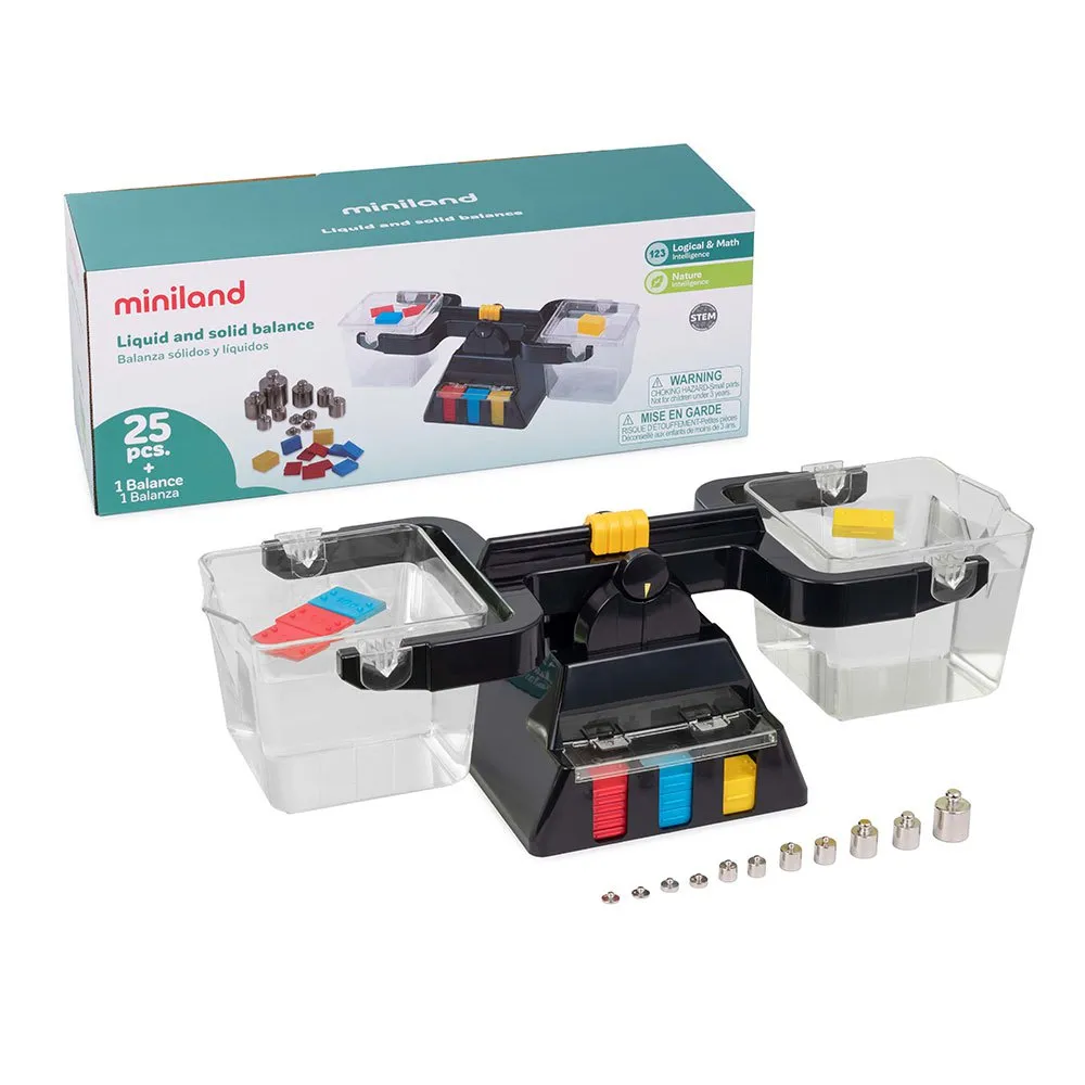 With buckets and lids, 14 plastic weights and 11 metal weights. Precise. Supports the notions of weight and equivalence.