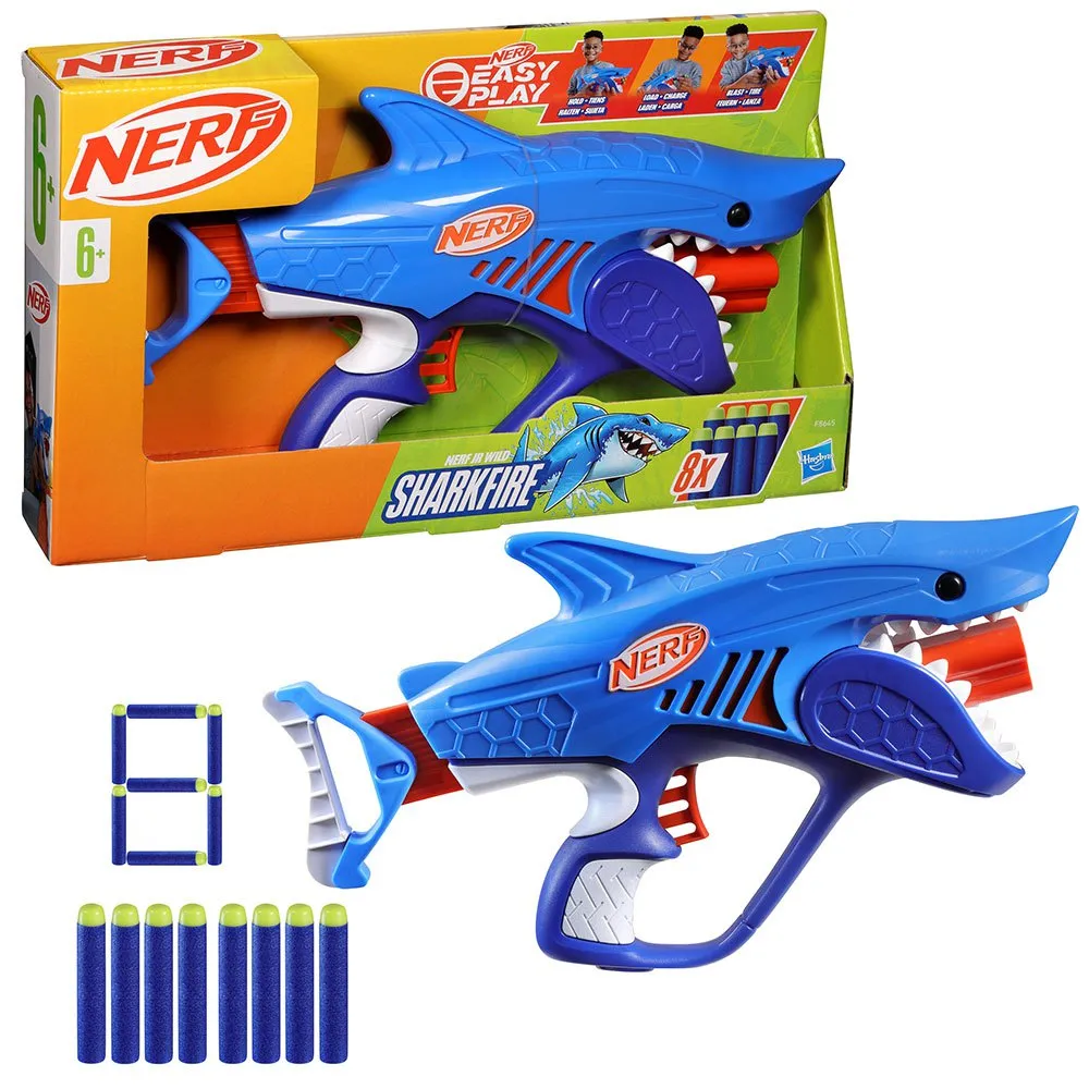 The Nerf Junior Wild Sharkfire blaster features a fearsome shark design that captures the look of this fierce fish with cool colors and exciting details! This Nerf shark blaster includes 8 Nerf Elite 2.0 darts.