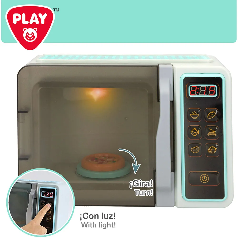 Cook faster with this PLAY toy microwave! Press the buttons to select different cooking modes and wait for the food to be ready to eat! Includes a turntable and a mini pizza.
