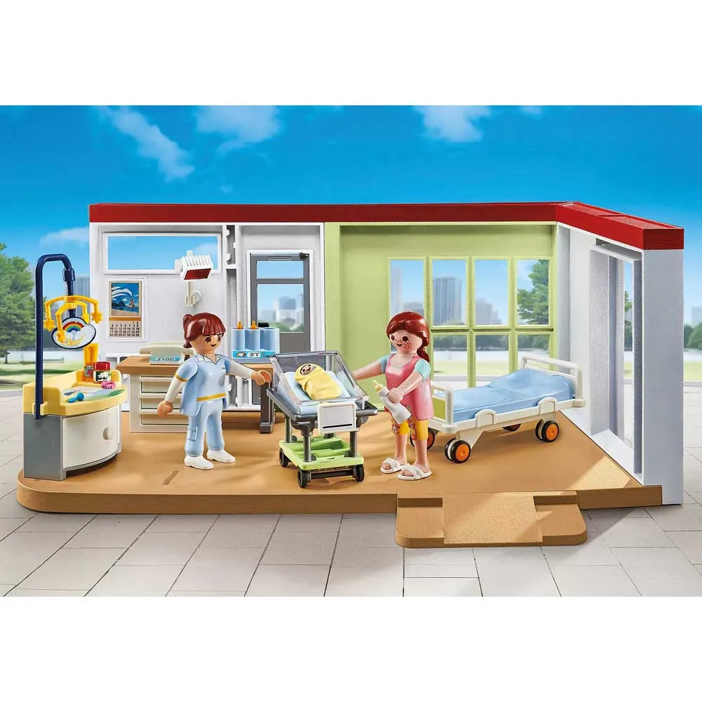 In the maternity ward, the well-being of mothers and their children is taken care o? The name of the youngest member of the family can be written on the sign on the baby´s cot, and a scale is available to check the weigh? This set can be attached modularly to the Modern Hospital (71615? The PLAYMOBIL Action Heroes Hospital World invites girls and boys to learn about life in a modern hospital and to play with themes such as care, treatment and illnes? The 62-piece toy set includes 3 PLAYMOBIL figures, a hospital bed, a changing table and many other extras for imaginative role-pla?