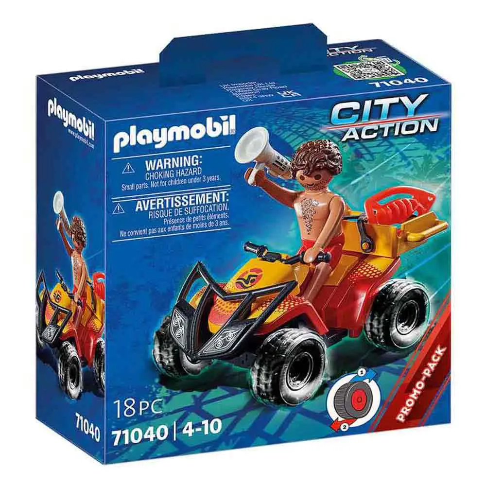 Great Beach Patrol Quad with pullback motor, PLAYMOBIL figure and accessories. Get ready for exciting adventures on the coast with the PLAYMOBIL Beach Patrol Quad! Whether on the beach or in the water, the lifeguard always has everything in view to be on the spot quickly in an emergency. With his maneuverable quad with the thick tires, he drives up and down the beach and attentively watches swimmers and bathers. With its practical pull-back motor, the Beach Patrol Quad ensures action-packed rescue operations in the children´s room. A great gift for birthdays, Christmas or other occasions for kids aged 4 and up. Specifications: The 18-piece play figure set includes a PLAYMOBIL figure, a quad with pullback motor, suntan lotion, megaphone and swimming board. Life buoy and megaphone can be stowed on the carrier and fixed with the silicone straps. Play with this set on its own or combine it with the other playsets in the PLAYMOBIL City Action series.